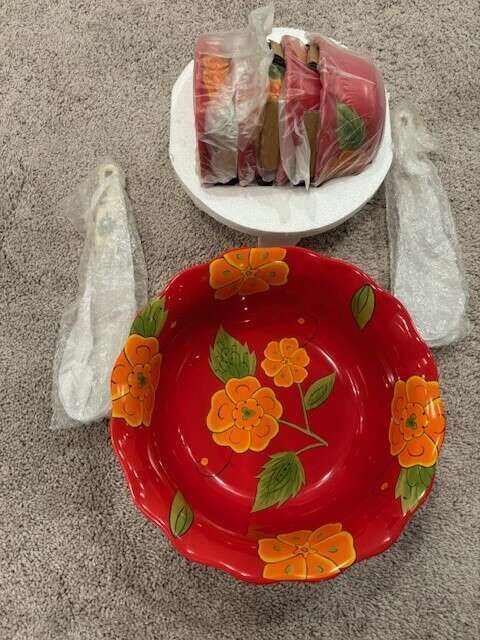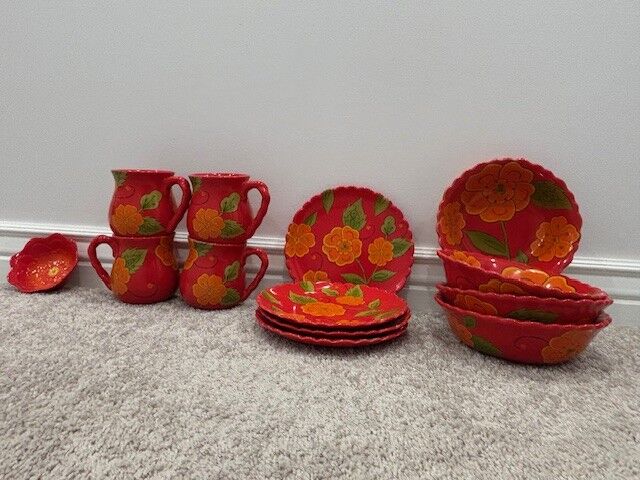 VenmoPop up your presentation. This vibrant set will bring a floral flair to your table. Includes four dinner plates, four cereal bowls, four mugs, one 4-qt serving bowl/four 14-oz bowls, and two serving utensils, one decorative dish