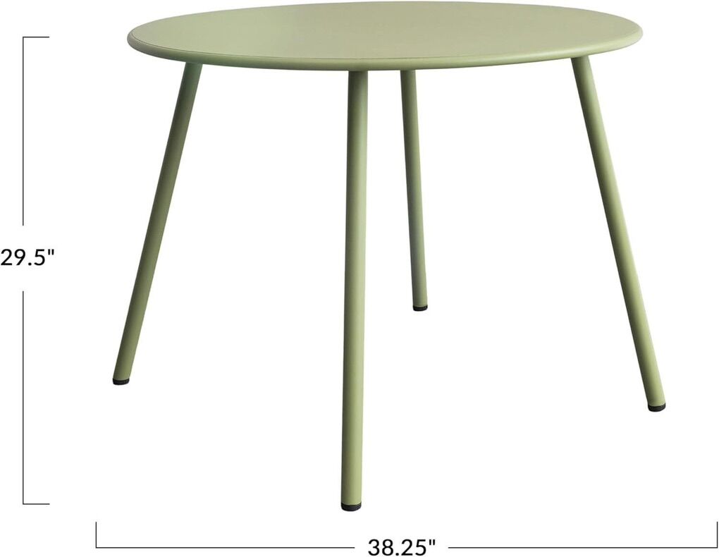 vibrant green round metal table with a sleek design and sturdy construction Ideal for coastal, modern, tropical, outdoor, and minimalist d cor styles Can be used both indoors and outdoors for versatile functionality Comes fully assembled and made of durable steel for lasting use 38.25 Diameter x 29.5 H.