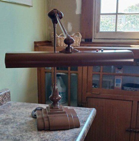 Excellent condition with working light. Articulated joints for adjustable lighting. Heavy for stability. Circa 1940-1970