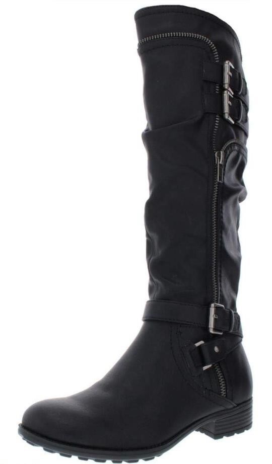 Elevate your footwear collection with these stylish Women's White Mountain Black Burnished Boots, size 5.5M. Crafted from high-quality materials, these knee-high boots feature a sleek black finish that complements any outfit. The design includes a combination of zippers and buckles, adding a touch of modern flair while ensuring a secure fit