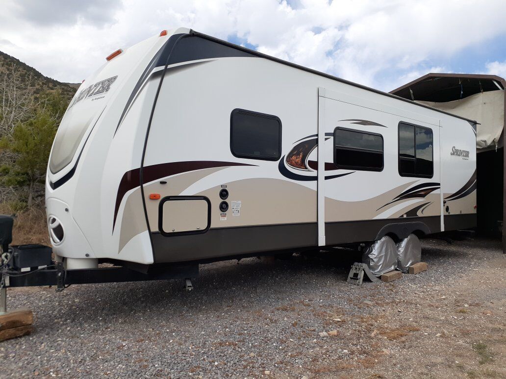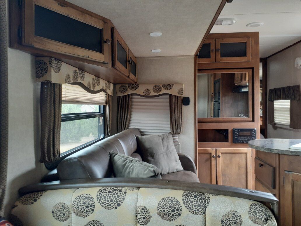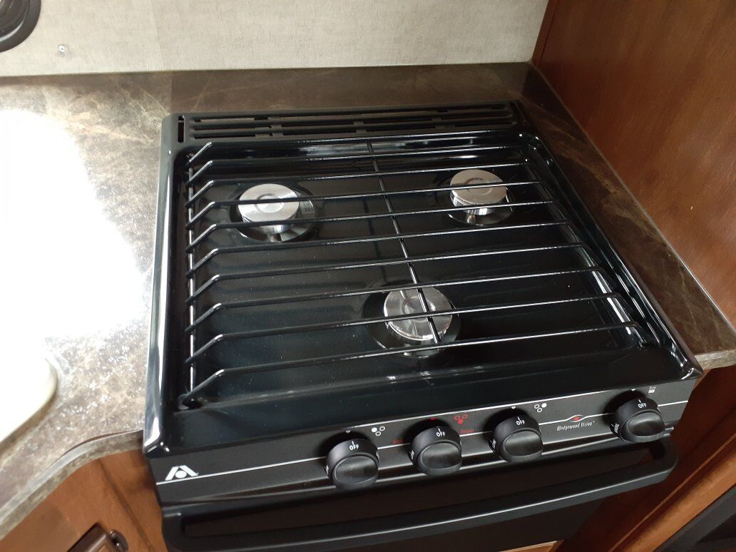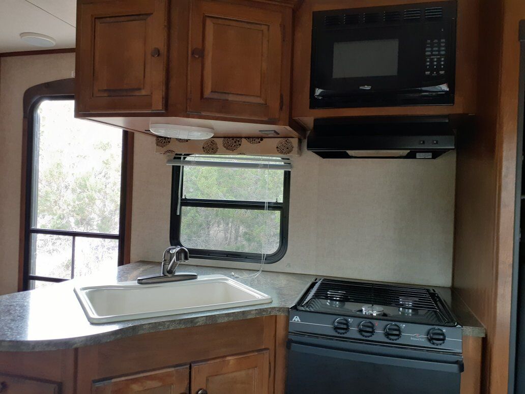 This RV has very many features that include: 1.outdoor kitchen with gas grill and fridge 2. great bathroom with glass encased shower, large storage space and my favorite a porcelain toilet 3. the interior and exterior are in great condition 4. it has 2 brand new batteries and 4 brand new tires 5. the appliances are black in color and in great condition 6. the rv has been cleaned inside and out after every use 7. it has a large comfortable bed 8. Looks like New inside and out.when not in use it is stored inside out of the weather. 9. the rv has Astrofoil Insulation which cuts down time when heating or running the ac unit