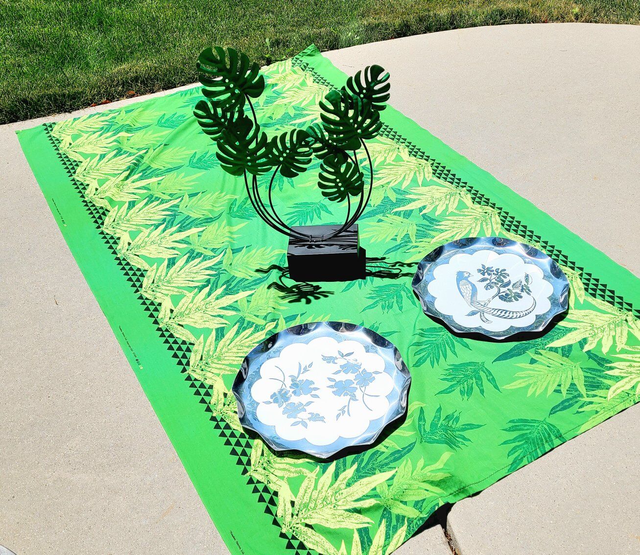 1 green fabric tablecloth 1 metal leaf sculpture 2 vintage aluminum trays with floral and bird etchings. Everything is included in the price.