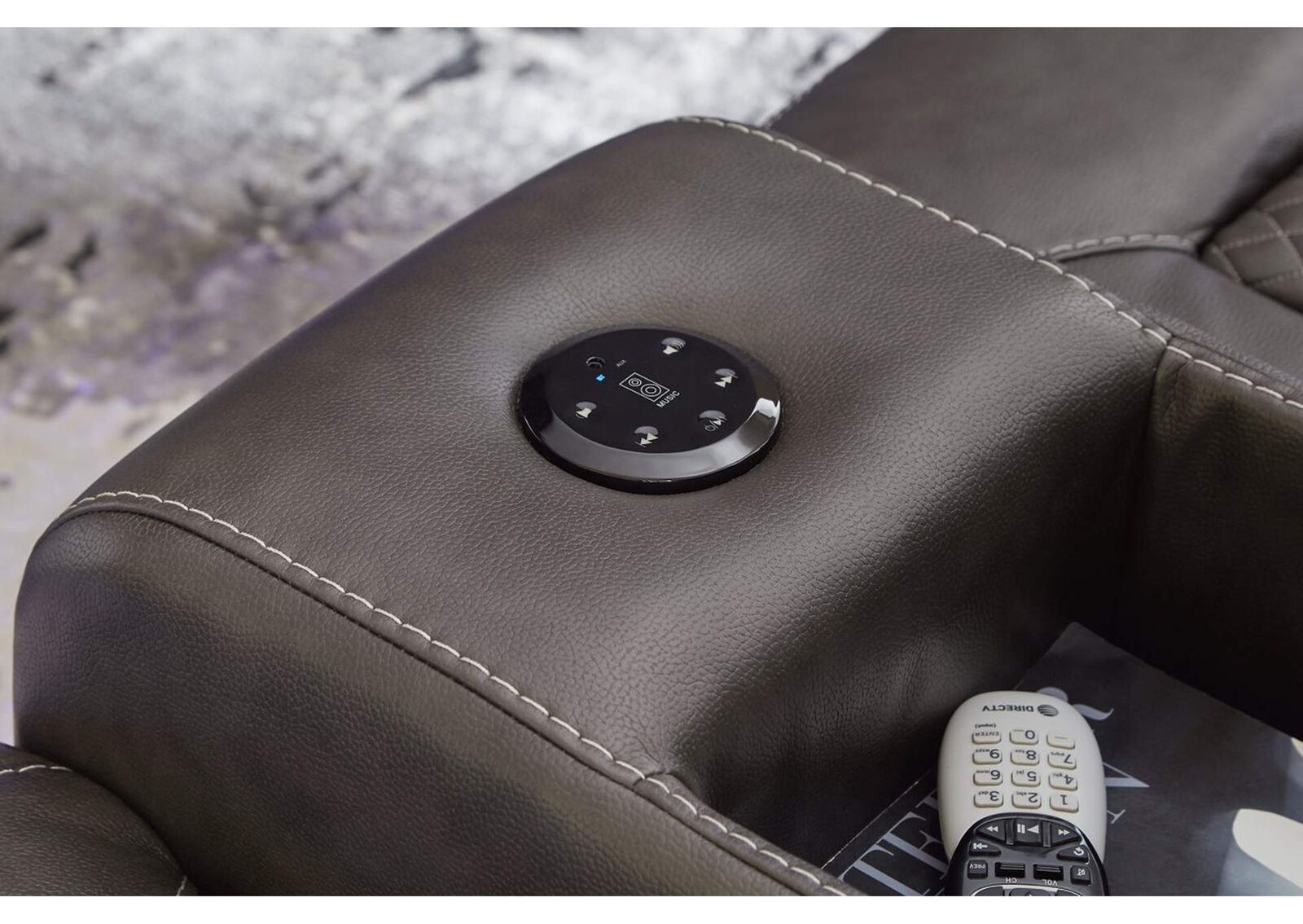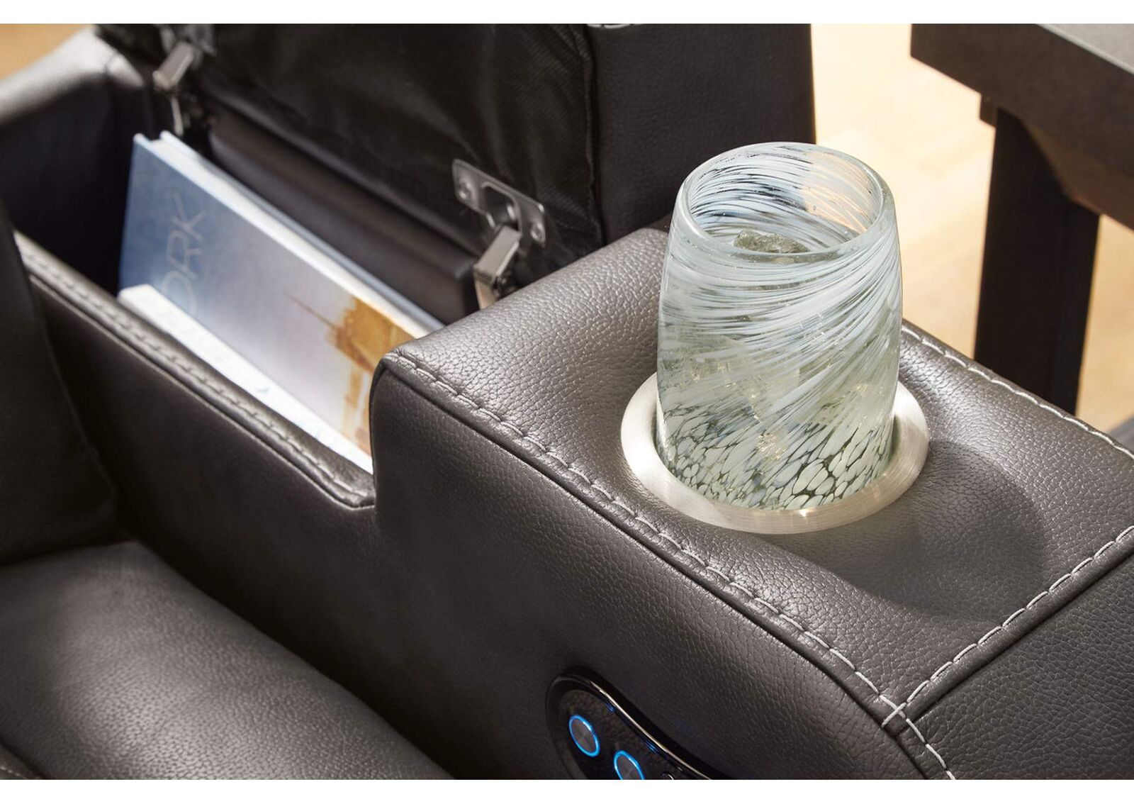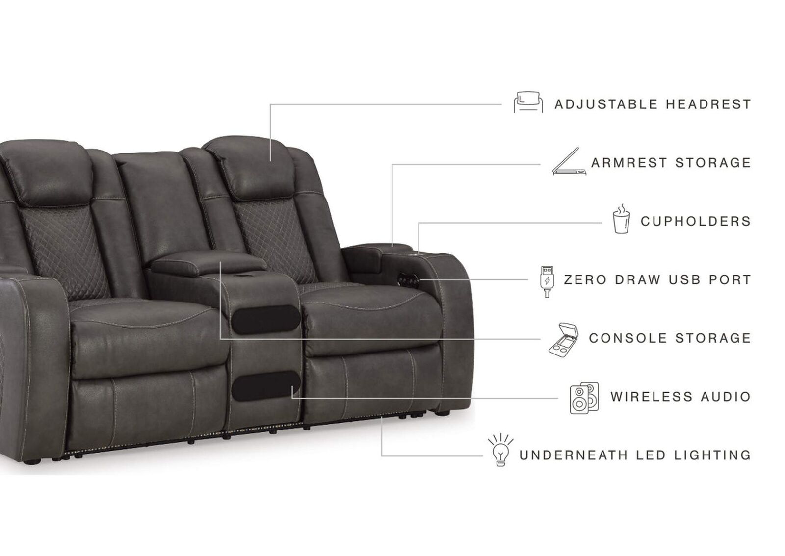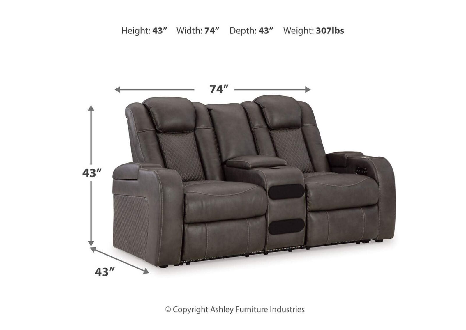 The Fyne-Dyme power reclining loveseat goes beyond basic comfort. It upgrades the everyday, turning your living room into an entertainment hub. Don’t want to leave your seat? Keep essentials in reach with cup holders and storage arms. You can create an even cooler vibe for family movie nights and friendly gaming matches with LED lights. Immerse yourself further with built-in wireless audio connectivity. And your sleek style isn’t compromised—its diamond stitching and streamlined arms recall the aesthetics of luxury automobiles.Arm height: 25 in
