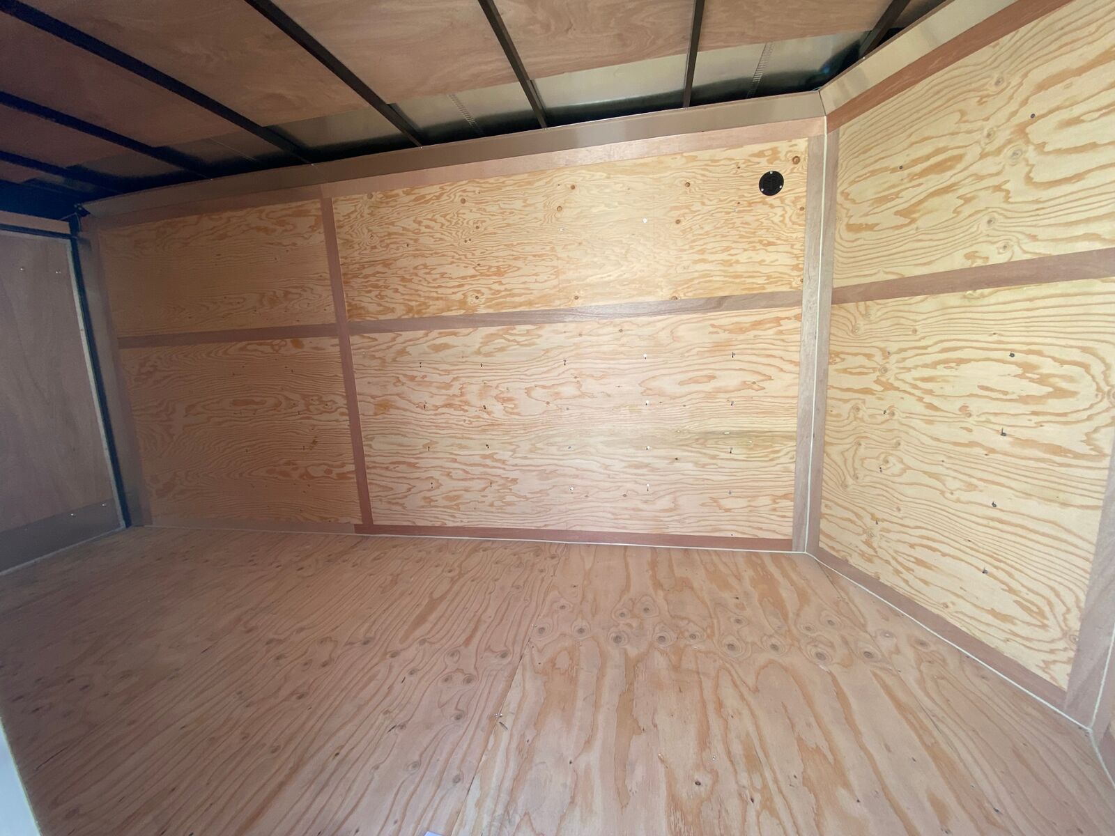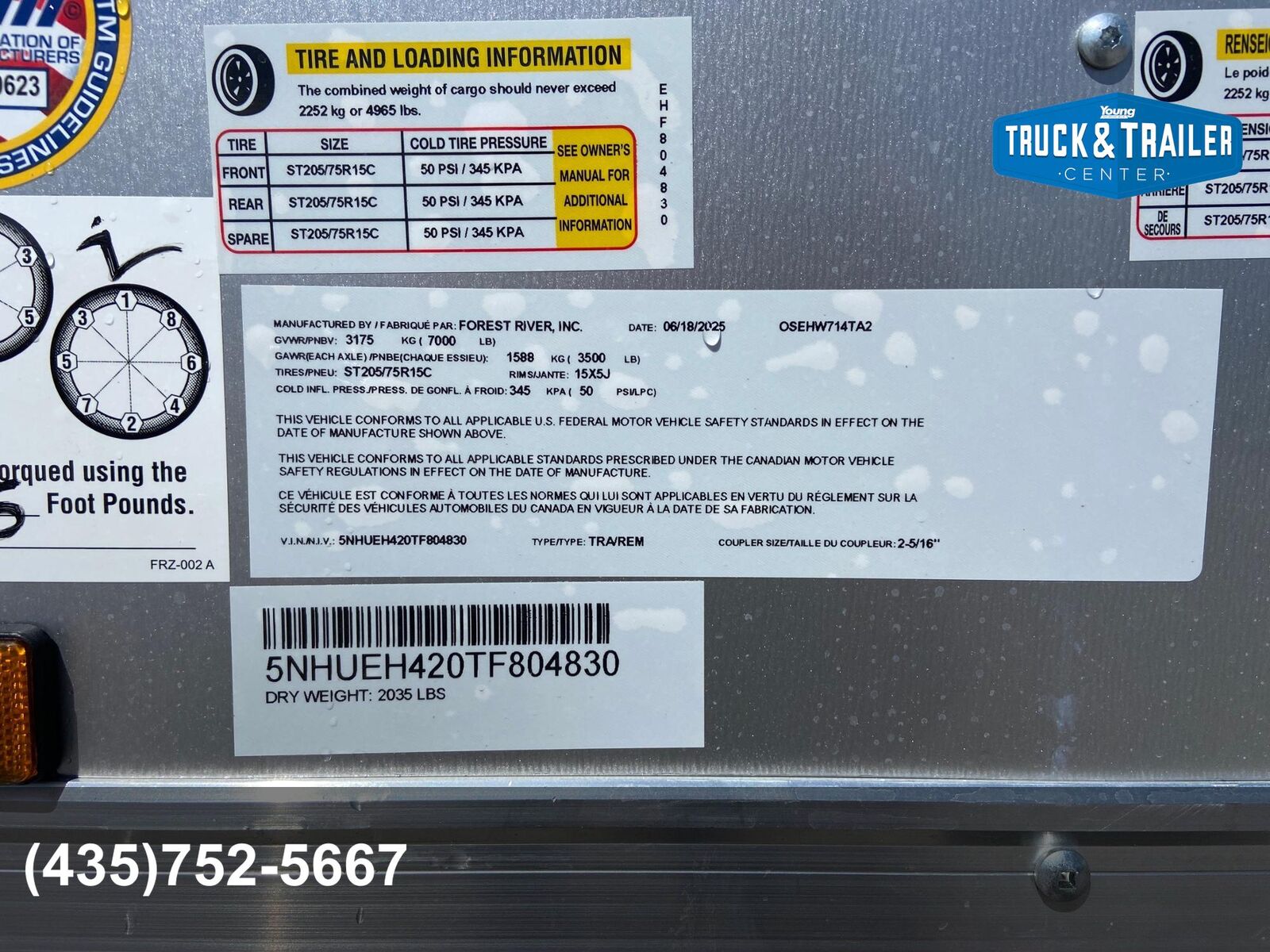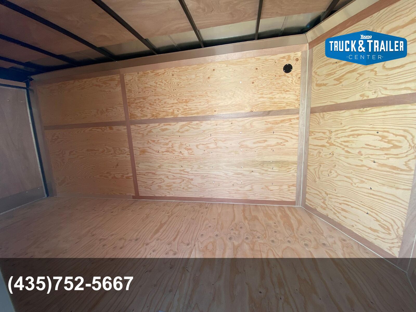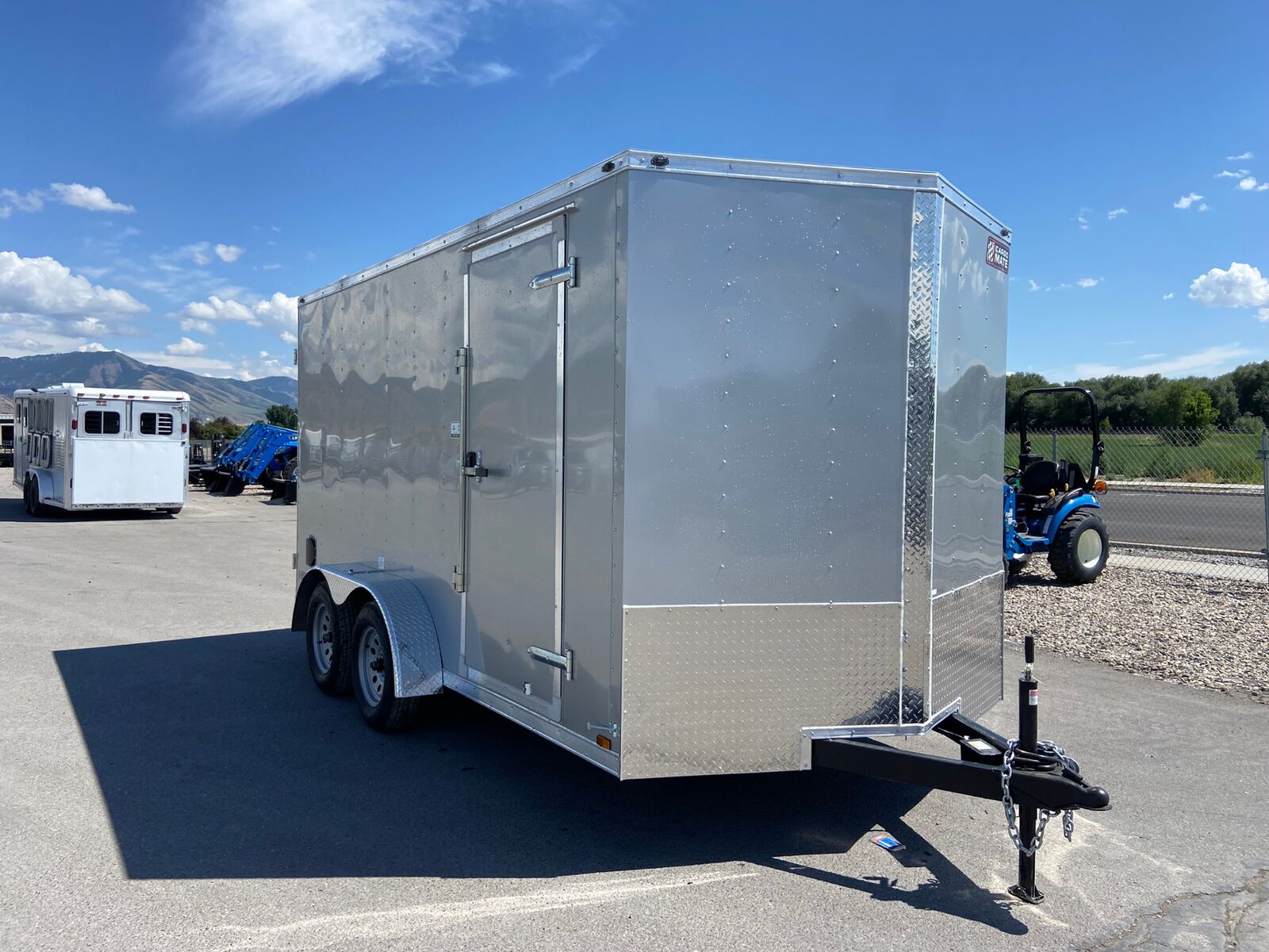 7X14 with rear barn doors 18” Wedge-Front Nose • C/S Door (24” on 5 wide, 32” on 6 & 7 wide, 36” on 8 wide) • Semi-Style Camlock Door Latch • Door Hold-Back on Rear Door • Leaf-Spring Axle • E-Z Lube Hubs • Silver Powder Coated Wheels • Radial Tires • Aluminum Top Rails • 16” ATP Stoneguard • (1) 12V LED Dome Light • (2) Flow Thru Sidewall Vents (on 5,6,7, & 8 wides) • Aluminum Exterior Fenders • Clear Lens LED Clearance Lights • Clear Lens LED Strip Tail Lights • DOT Lighting • License Plate Holder with Light • .030 Aluminum Exterior • Anodized Aluminum Wrap • Exposed Steel Painted Epoxy Black • Undercoated Frame • Tongue Jack with Sand Pad • Welded Safety Chains • Full-Color Decals