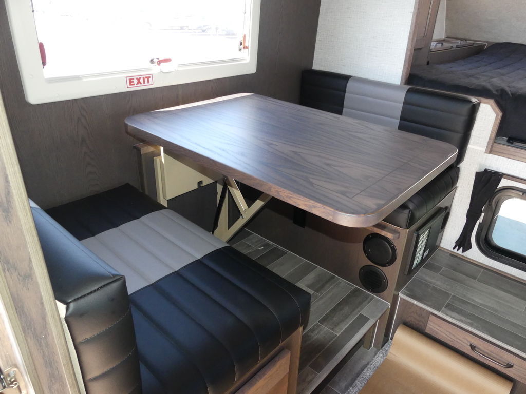 The interior of a Limited Edition truck camper features a solid Sapele hardwood table, premium leatherette seating, and S4 Deluxe -Dometic windows, plus many other standard and optional features.