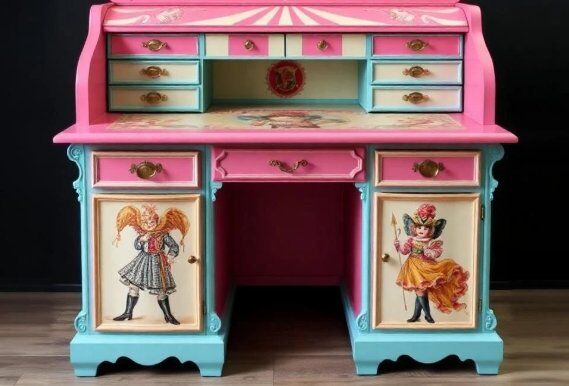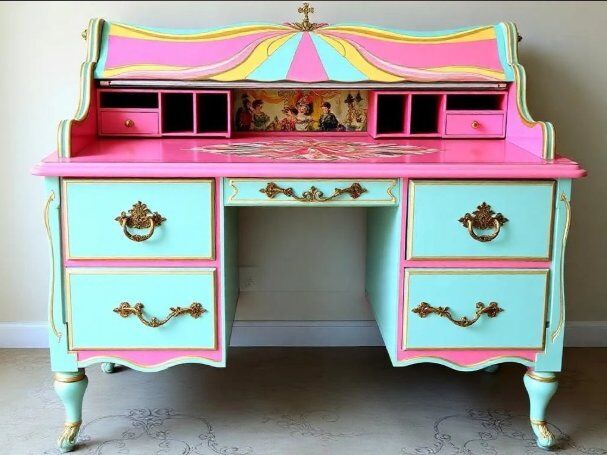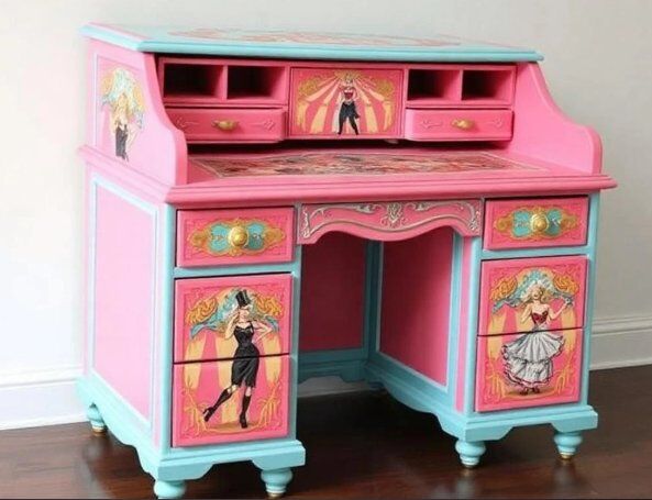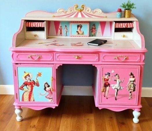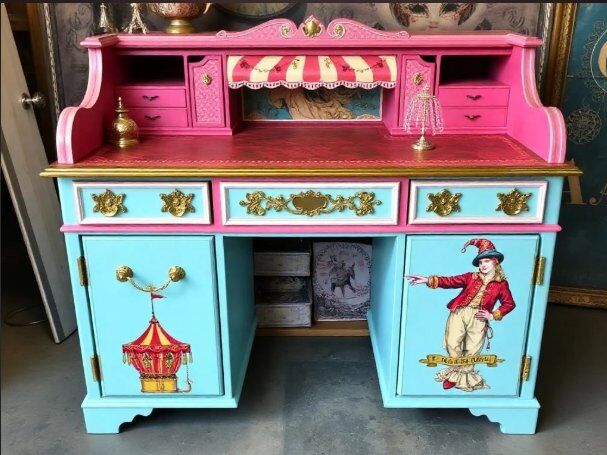 Price is determined on size of desk request, if commissioning a chair/stool, and if shipping is neededCommissions Accepted!! Please message me if you would like a Vintage Carnival Showgirl-Themed Art style created for you! Customizable Colors Photos represent our work with previous customers, which can be duplicated or customized to your taste. CAN BE PURCHASED WITH OR WITHOUT MATCHING CHAIR OR STOOL!! Create the perfect space to welcome customers in your small shop, design your latest artistic endeavor, research clown core, review upcoming customer appointments, or just enjoy having your office workspace reflect your Vintage Carnival Showgirl-loving aesthetic! We can create custom colors to suit your preferences and decoupage as you'd like. This will be an heirloom piece to cherish for generations. Smaller desks can be requested for kids, and we work locally to source just the right antique rolltop desk for your home. We look forward to designing your Vintage Carnival Showgirl space! Desk sizes may vary; Please message us with any requested dimensions and desk style you prefer to work with Custom orders generally take 2-4 months to complete. The majority of our items are antique or vintage and by definition, pre-owned. We carefully check each item, but normal wear and tear is to be expected. We do our best to include any minor problems in the description or to show the condition through our photos, so please look closely. Item images are considered a part of the item description. We're happy to answer any questions you may have and send additional images if necessary. Custom Orders: Love the style but have a different color in mind? I accept custom orders! Contact me to discuss your dream furniture piece. www.lavienouveaudecorshoppe.com - Follow us on Instagram @la_vie_nouveau_decor_shoppe Thank you for visiting our shop!