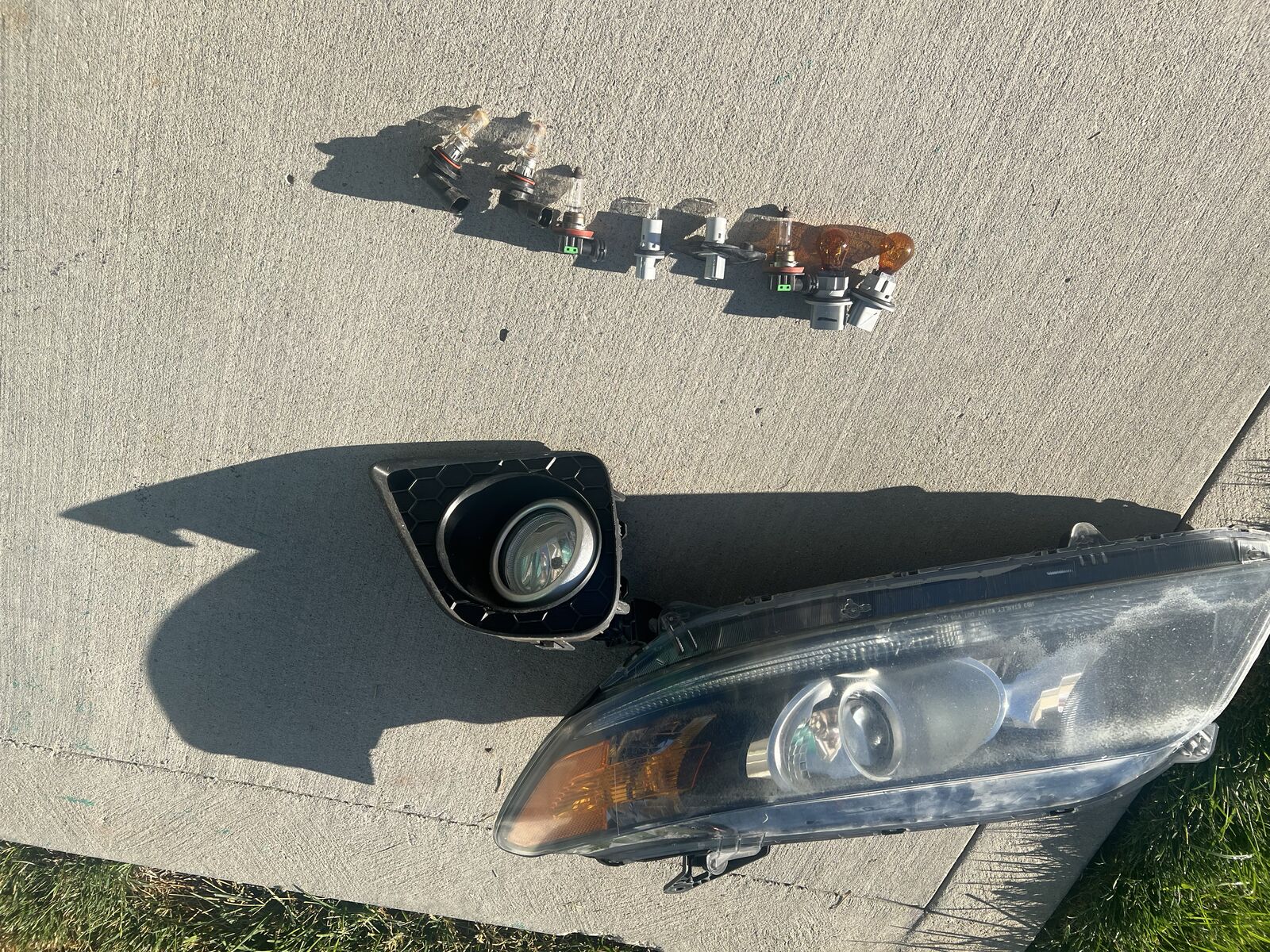 The passenger side of the car was damaged. We replaced both headlights. This headlight works. Various headlight bulbs included.