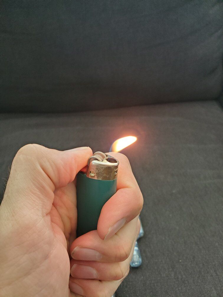 Lighters all work and have various amounts of lighter fluid left inside. The striped lighter is refillable but is currently empty.