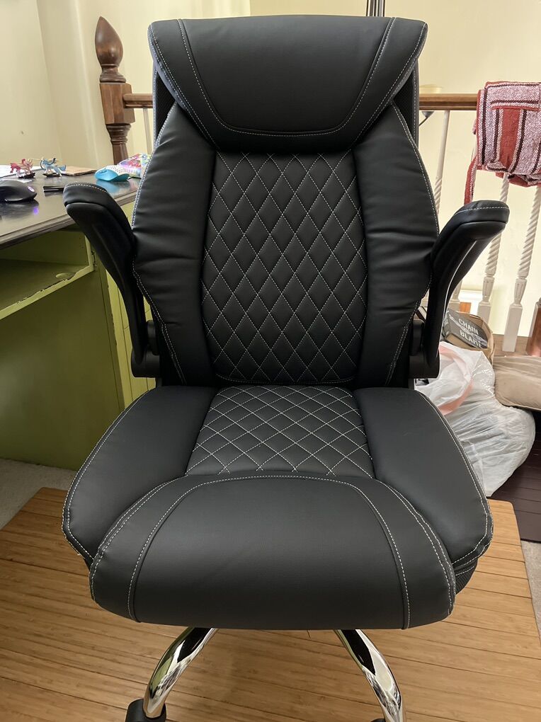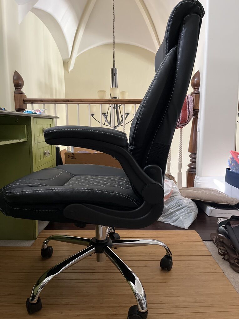 VenmoThis fully assembled black office chair provides good upper back support while bolstering a comfortable seat and adjustable arm rests.