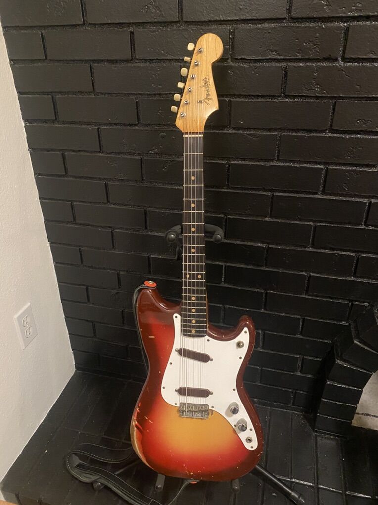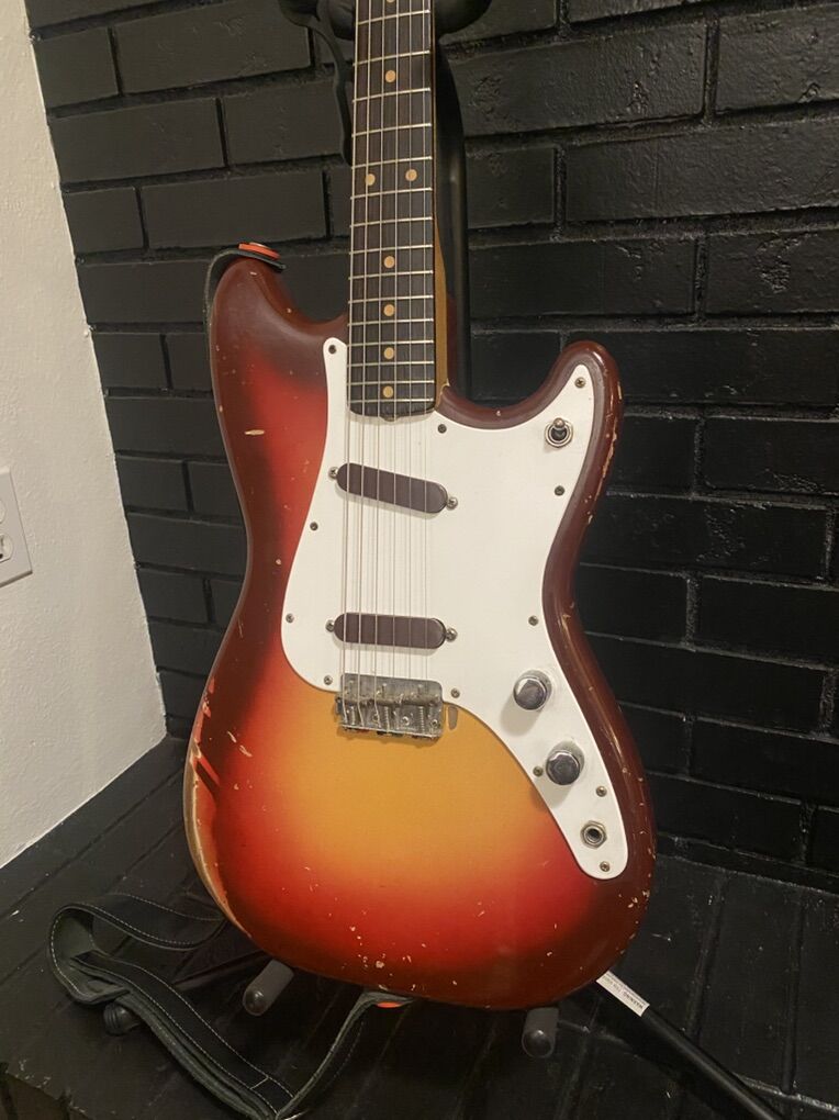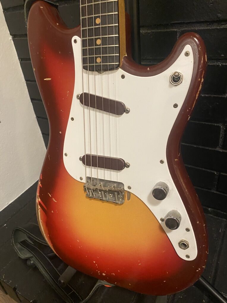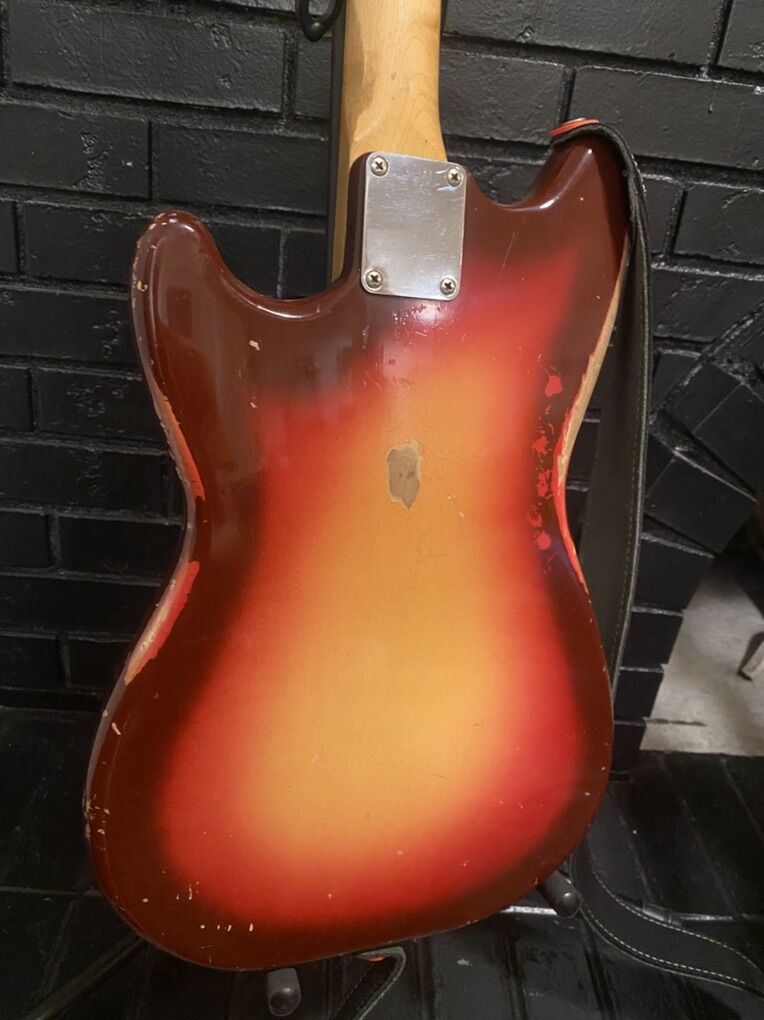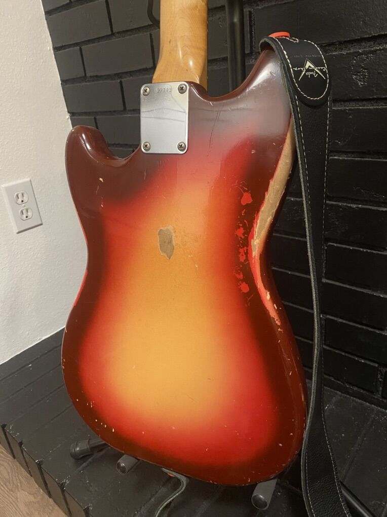 This guitar appears all original except at one point someone added late 60s style racing stripes like the competition Mustangs with tape. That has been removed but the stripes are still evident because the finish was protected under the tape. Cool!!