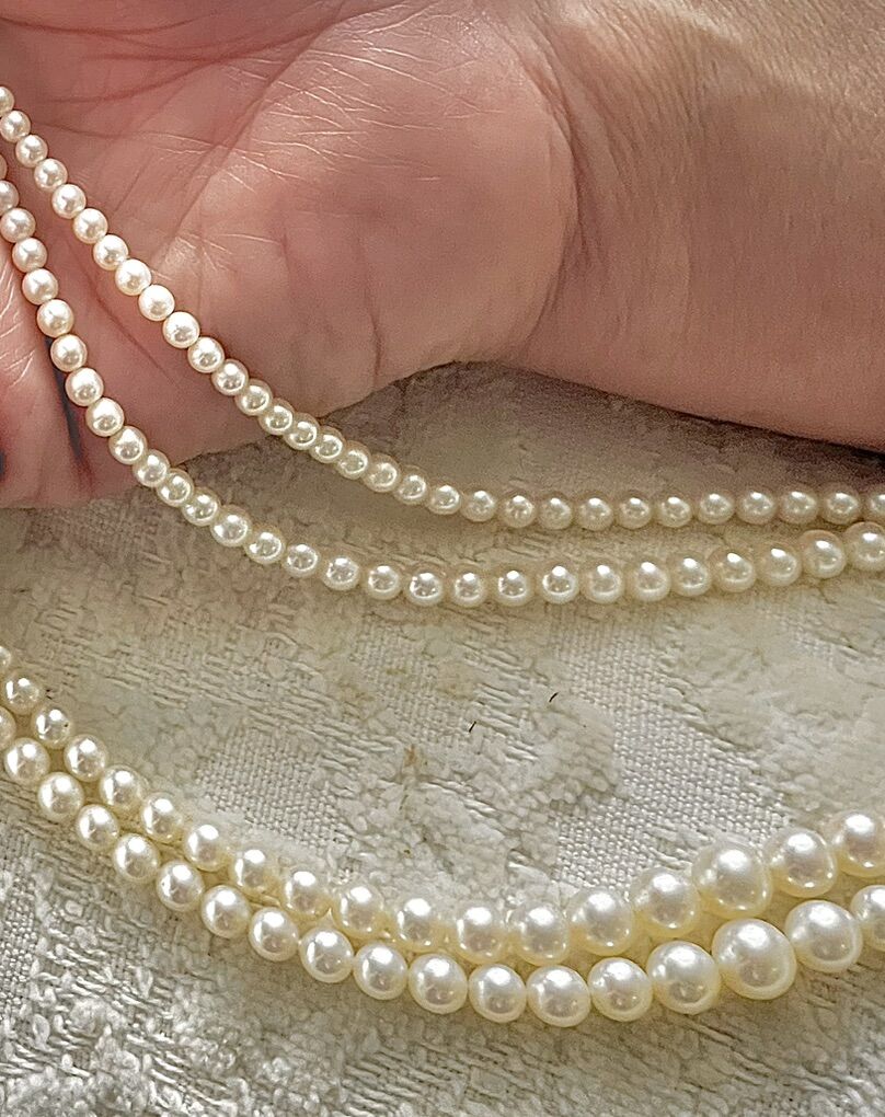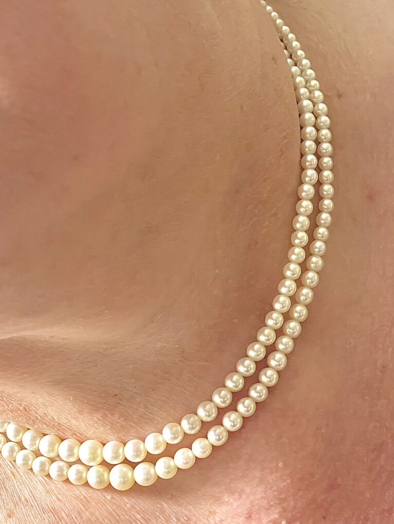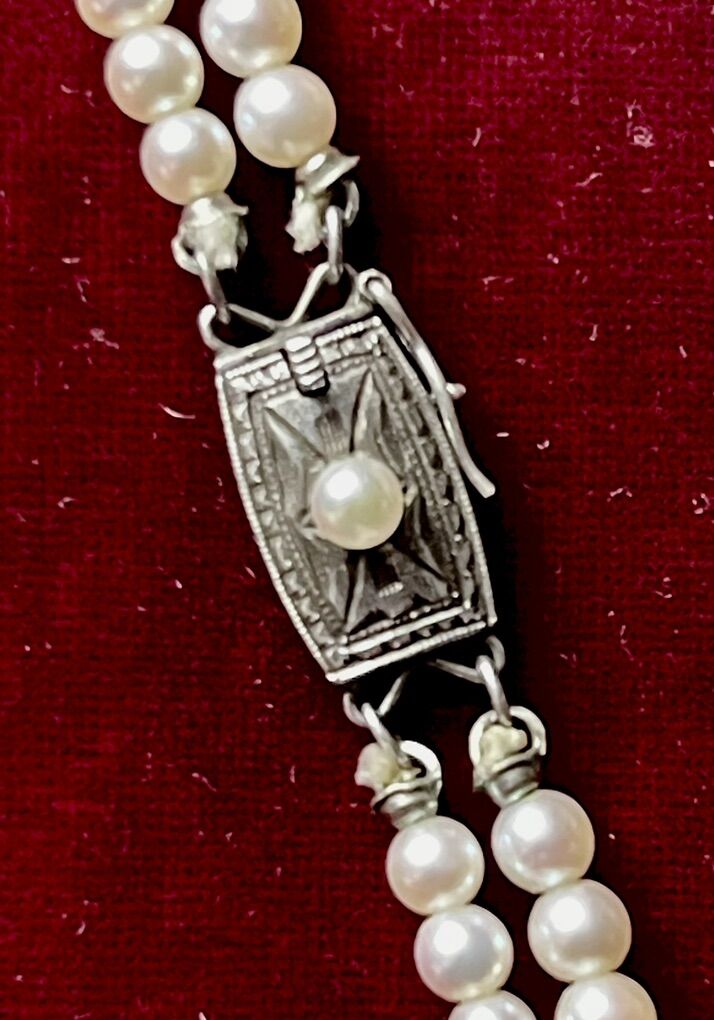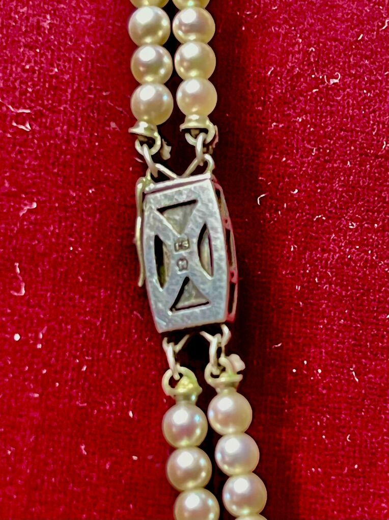 VenmoDouble strand of cultured pearls, perfect as a mother's gift or for a bride or an awesome Christmas gift for someone that really care for. The AA+ quality, pinkish-cream color Akoya pearls are from K. Mikimoto Company, Ginza Tokyo. The upper strand has 95 pearls, 17 inches long, and the bottom strand has 103 pearls, 17.5 inches long. The pearls taper in size from 3.3mm to 7.0mm. The engraved sterling silver Mikimoto clasp contains a 3.2mm pearl on top. Includes original pouch and appraisal document signed by a GIA appraiser.