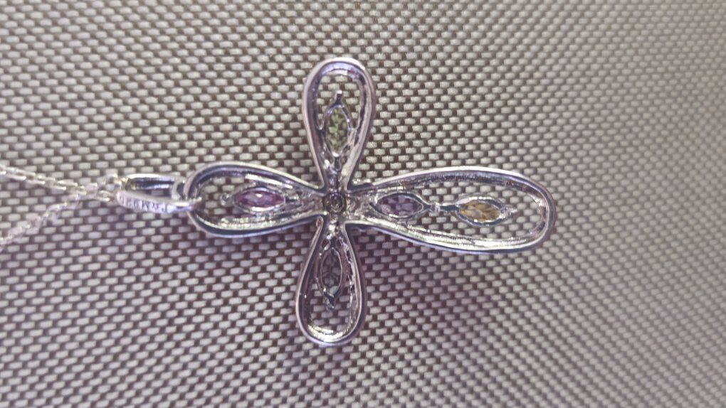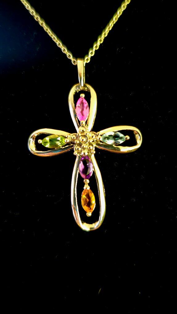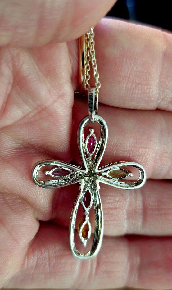 ELEGANT, shimmery, faceted blue, pink, purple, green, & yellow SEMI PRECIOUS gems outlined by sterling silver 925 cross pendant. SIGNED P️M 925 with a dainty floral daisy middle and an open back and sides to allow the light to shine through the semi precious gems. Comes with 18" Sterling Silver delicate, but strong, chain.