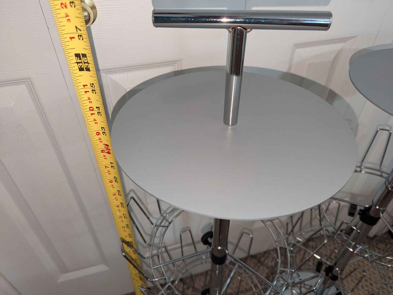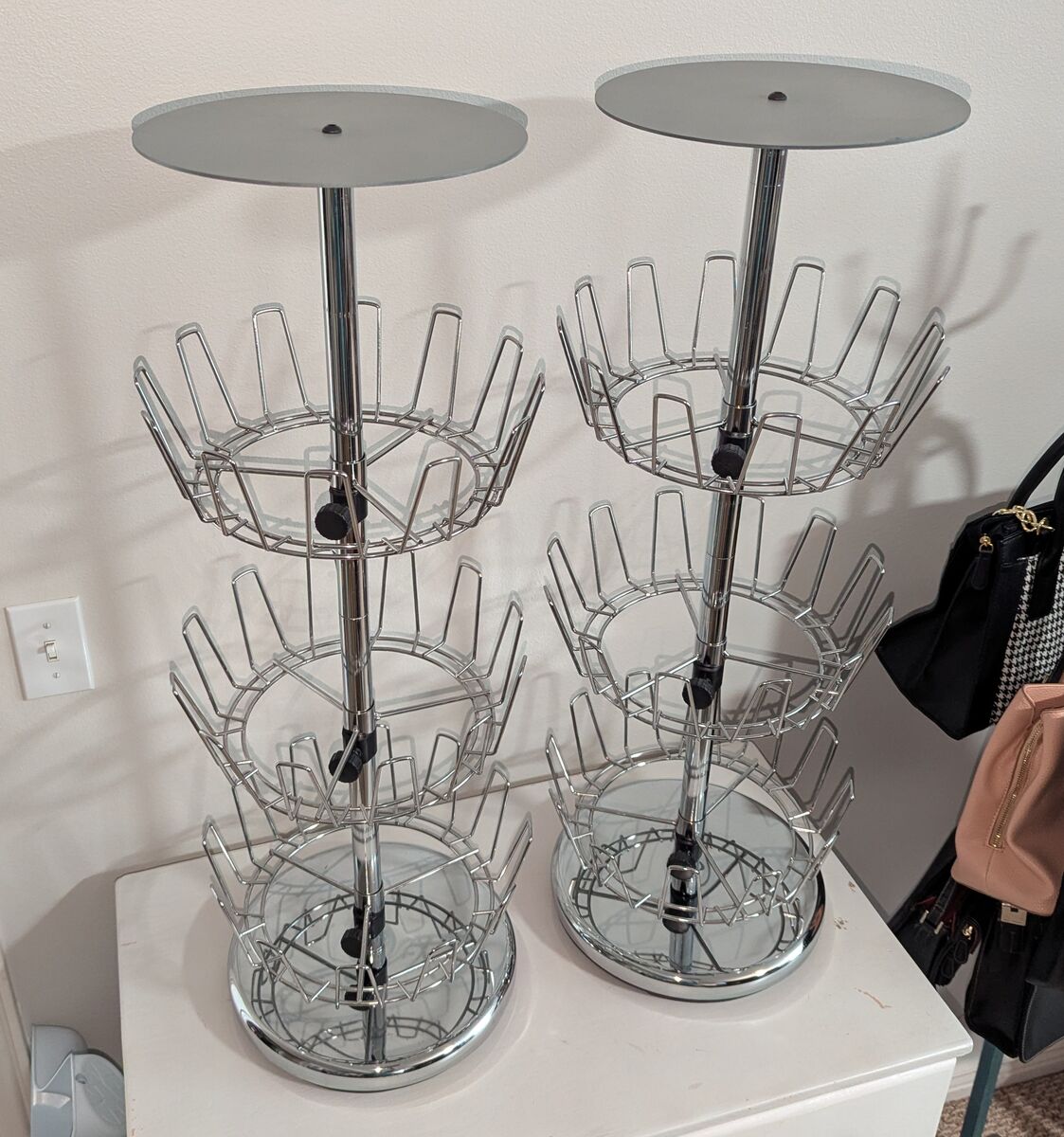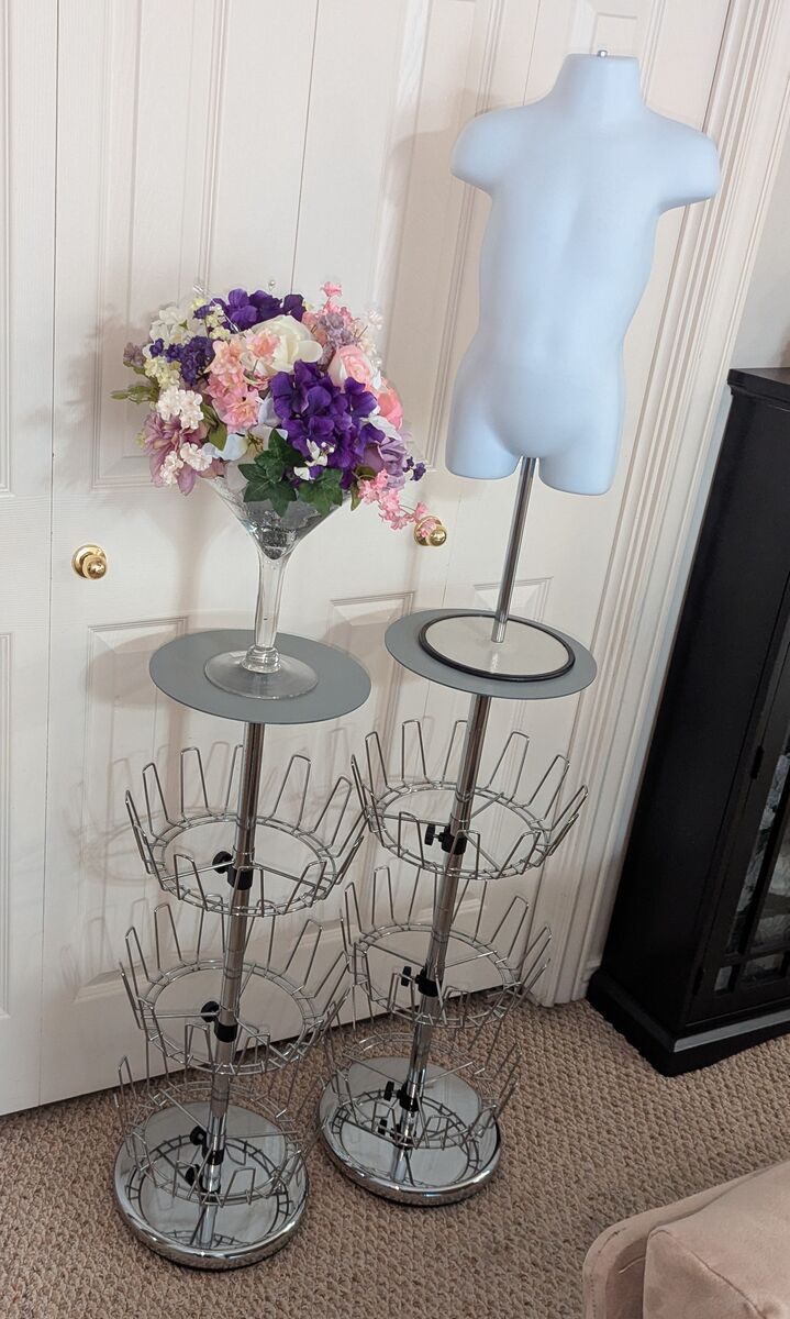 Three Tier Rotating Basket Displays - 2. Designed for displaying childrens shoes. Height 33", metal top measures 10". Can be used with or without metal top shelves. Can be used with or without top T handles.