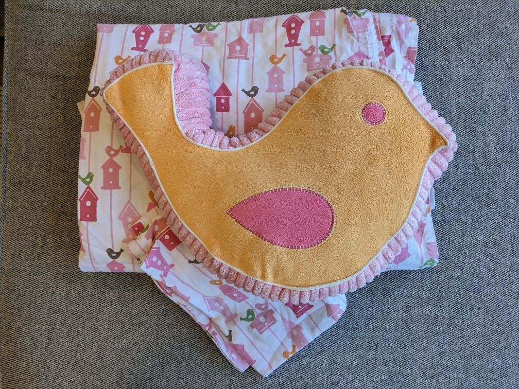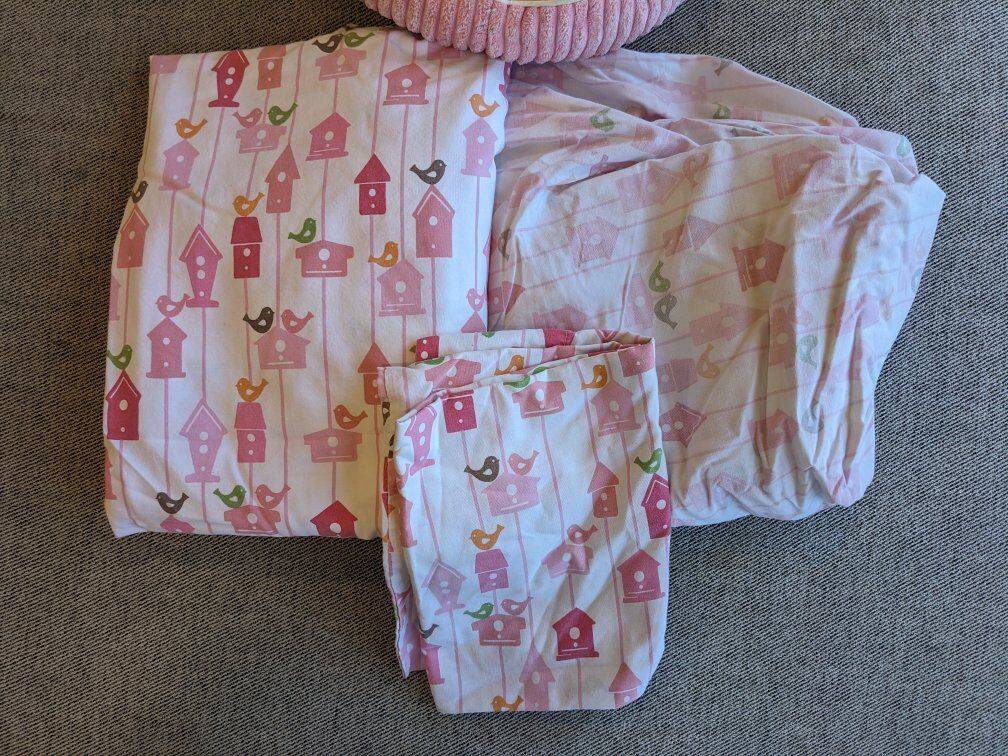 Like new condition! Includes twin bed sheets set: flat sheet, fitted sheet, and pillow case. Includes matching reversible bird decorative pillow. Comes from smoke free, pet free home. Cash only please. I can meet at the Kaysville Library (Tuesdays or Fridays) or the South Weber Maverik. Please see my other ads. Thanks!