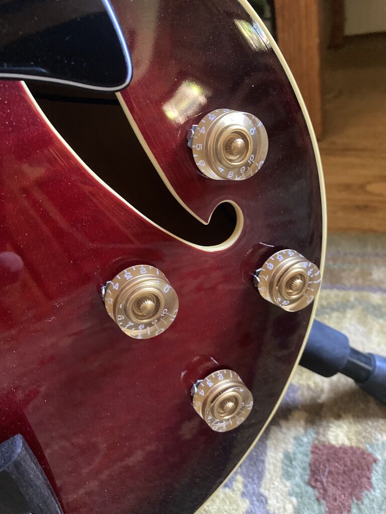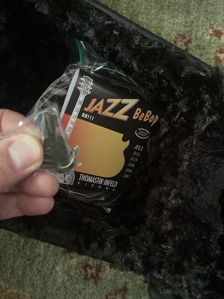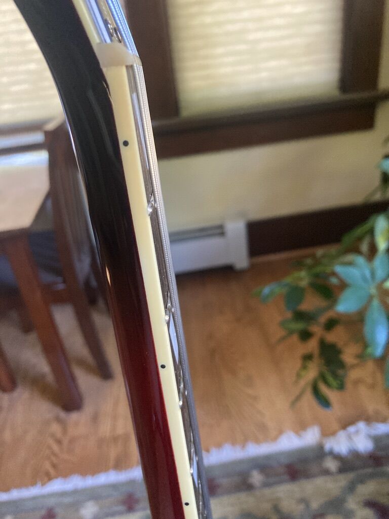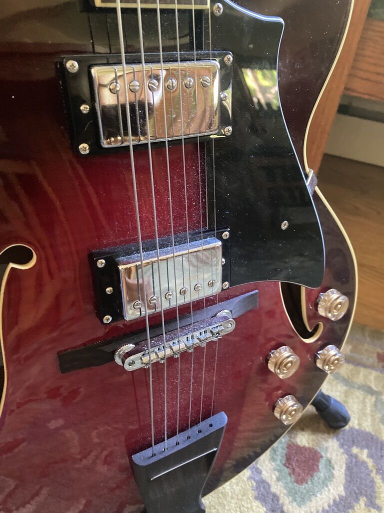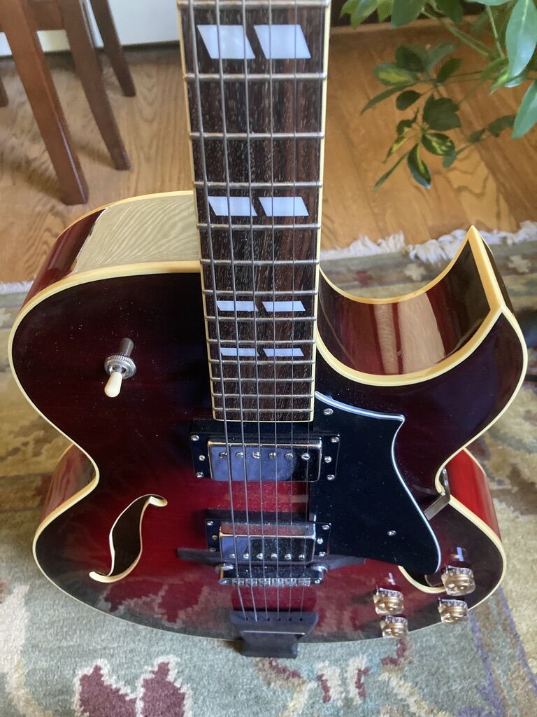 Acrylic Mother of pearl fretboard inlays and bone nut. 1.69" nut and 24 3/4" scale. Sound tone and playability almost identical to a Gibson ES 175 at a fraction of the price! Also included is the original hard shell case. Asking $875. Thanks for checking out the listing.