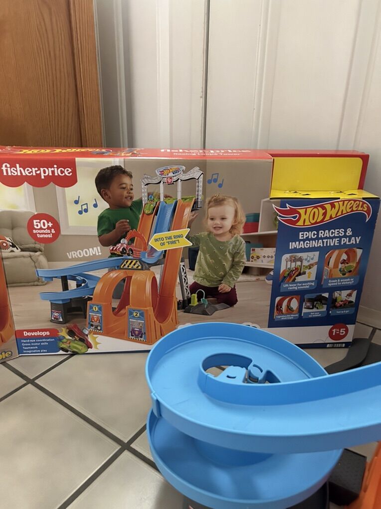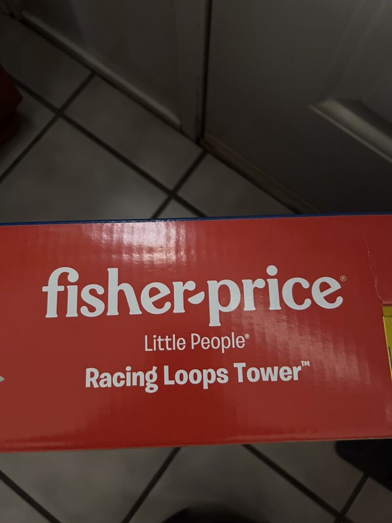 This is a fun play set for kids! We have the original box. So if you want to wrap the box for Christmas…. The play set will already be put together. It is just like brand new. We have Both cars. Fisher Price Little People Racing Loops Tower… it also makes sounds.