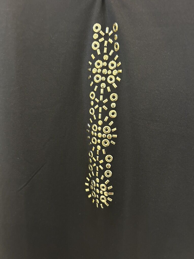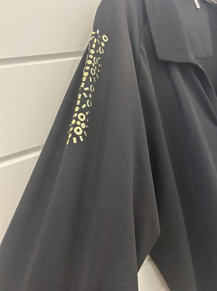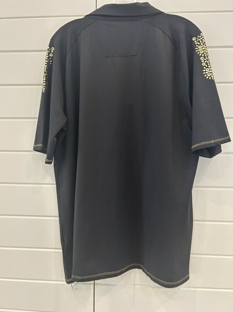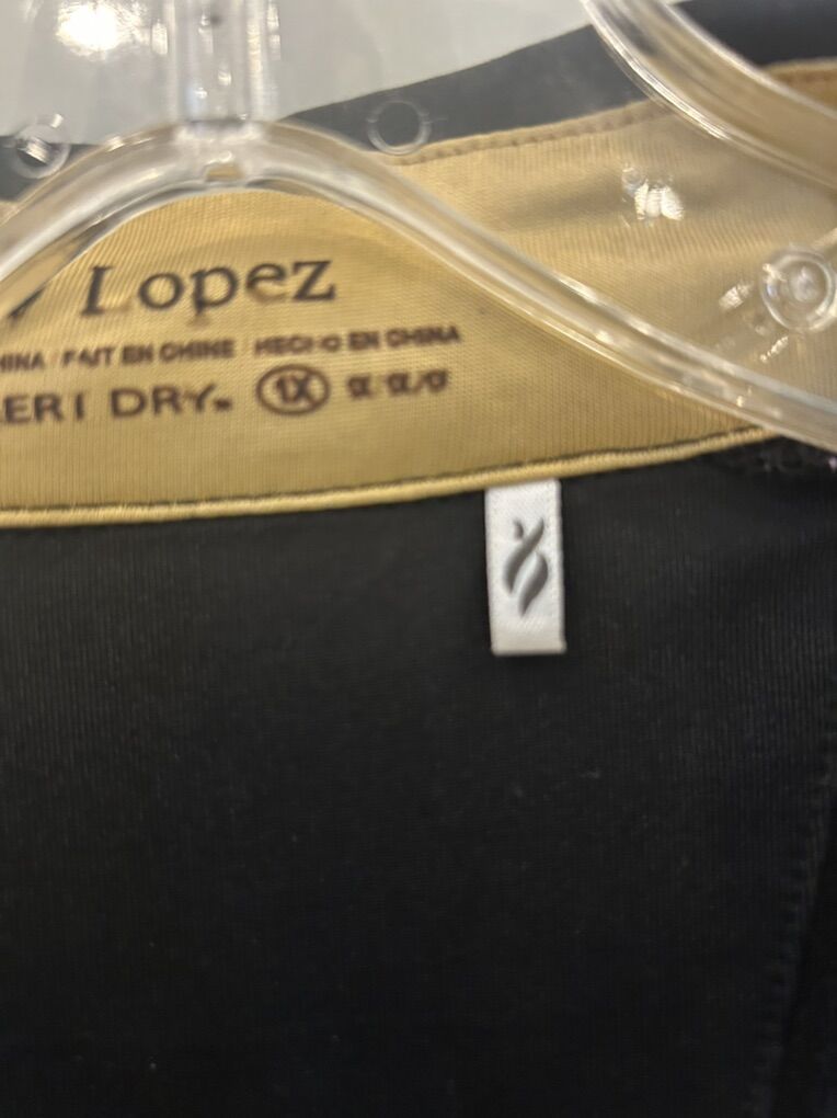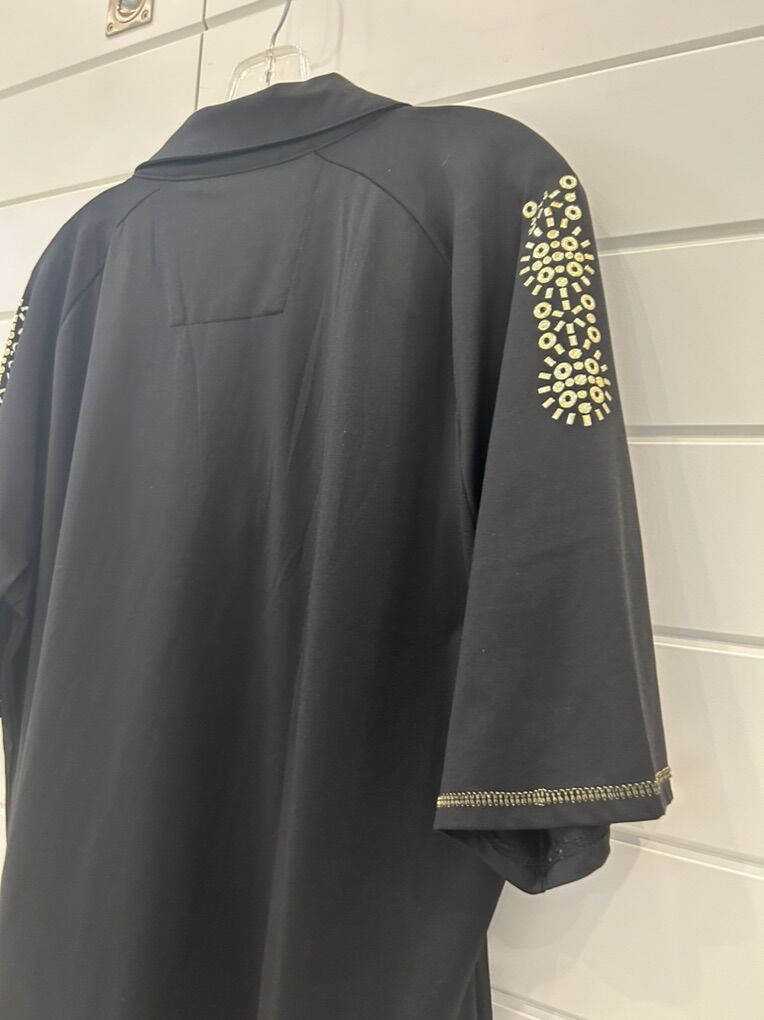 ZelleThe Nancy Lopez Golf Shirt in 1X Black Gold is a stylish and functional piece of activewear suitable for both golfing and casual occasions. This pullover polo shirt features a collared neckline and studded accents, with a slimming and lightweight design that is quick-drying and wrinkle-resistant. Made from a blend of polyester and spandex, this shirt offers a comfortable and stretchy fit, perfect for the active woman golfer. The black color makes it versatile for wearing in various seasons, and the accent of gold adds a touch of elegance to the solid pattern. Machine washable for easy care, this shirt from the Nancy Lopez Golf brand is a must-have for any female golfer.