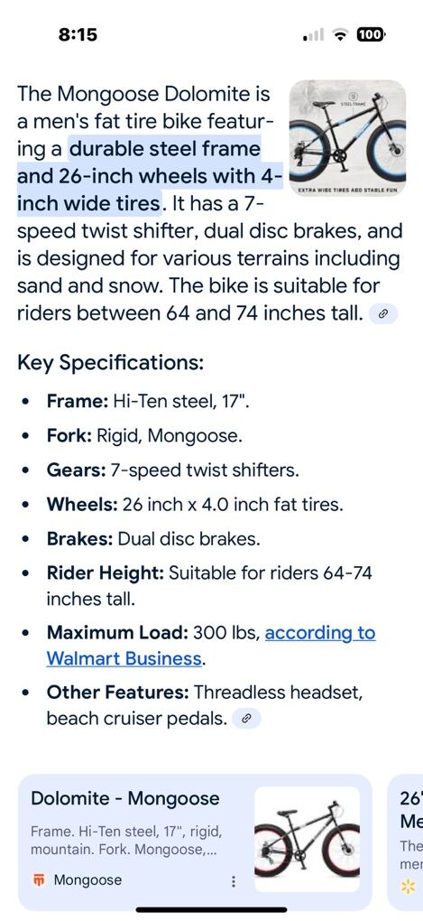 Mongoose Dolomite Fat Lire Mountain Bike 17” Frame. 7 Speed Swift Shifter. 26” X 4” Fat Tires. Dual Disc Brakes Great Condition Like New See Pics