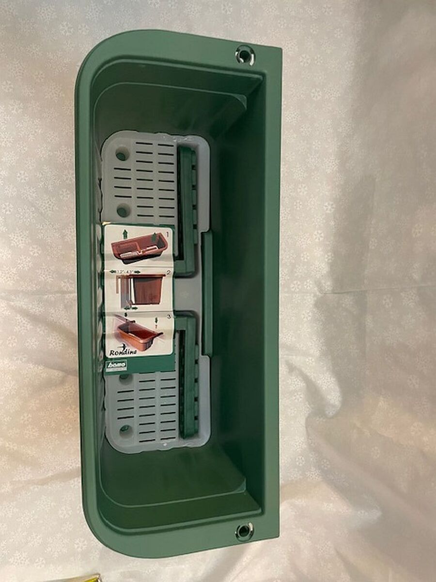 The adjustable planter box in the image appears to be a product from the brand "Romano" (as indicated on the label). It is designed with a modular, adjustable structure, allowing you to customize the size or configuration to suit different planting needs. The box includes a green outer frame and an inner adjustable insert with perforated sections, likely for drainage. The instructional images on the label suggest it can be set up in multiple ways (e.g., with one or two compartments), offering flexibility for growing various plants. This type of planter is typically used for herbs, flowers, or small vegetables and can be mounted or placed in various locations, such as a balcony or window sill.