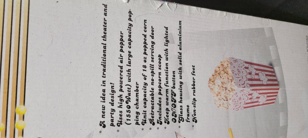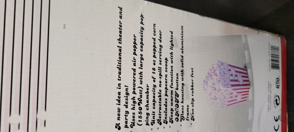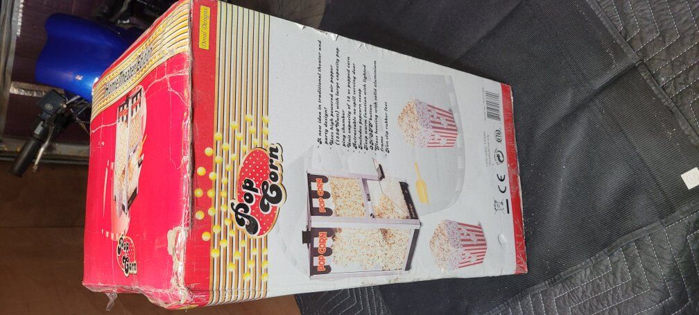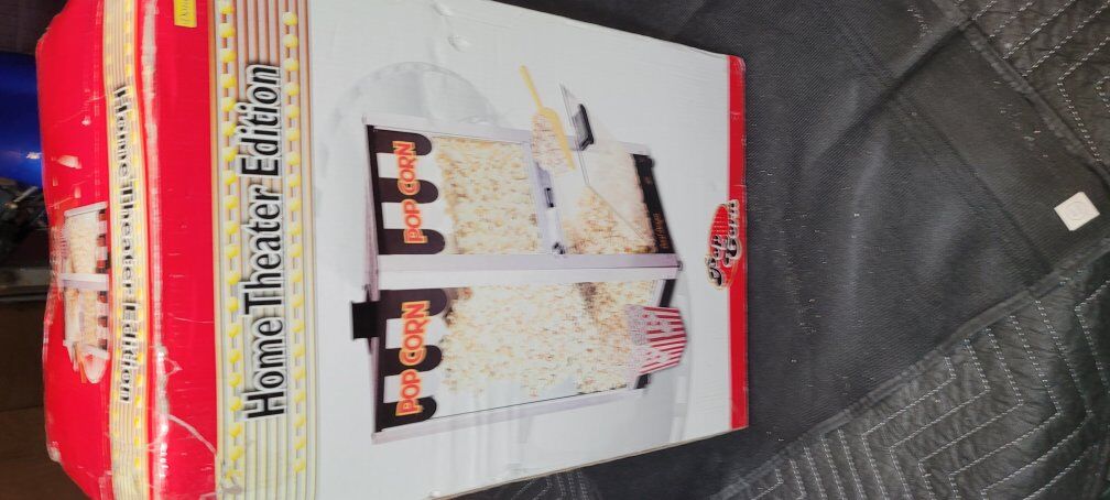 New popcorn maker movie theater grade popcorn maker new in box. comes with scoop, popcorn containers. what a cool item to have for your theater. in your home. have it in your office have it in your business. have it in your cave. wherever you want a really cool machine to make popcorn. asking only 40