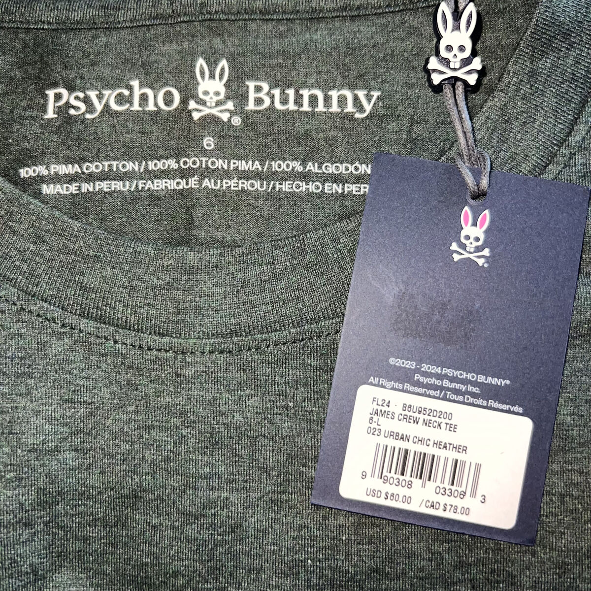 Venmo$40 each, the price is firm. Paid $60 each at Dillard's. Psycho Bunny James Premium Crew Neck Tees. I have 3 colors available - black, heather tan, and urban chic green. They are all size 6, which is a size Large in Psycho Bunny. The James Premium is a step above the Classic Crew Neck. The James is made of a premium pima cotton that has a more structured mid-weight fit, offering a smoother, silkier feel in comparison to the classic crew.