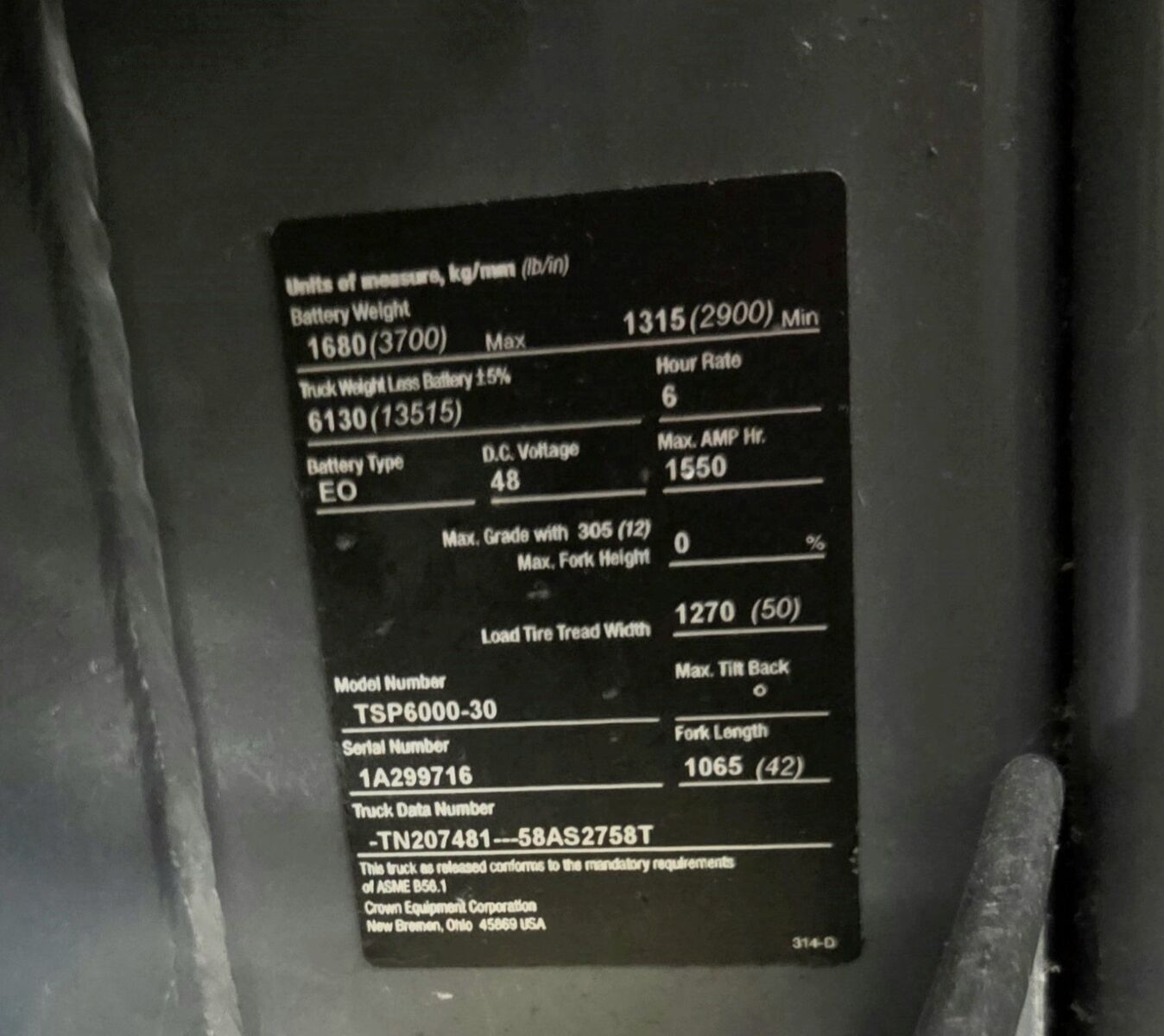ZelleCrown TSP6000-30 narrow isle forklift can pick pallet from either side of pallet racking 2006 (2) 48 volt batteries with battery rack 17k hours running hours 9k hydraulic hours includes 48 volt charger lifts approx 25ft high