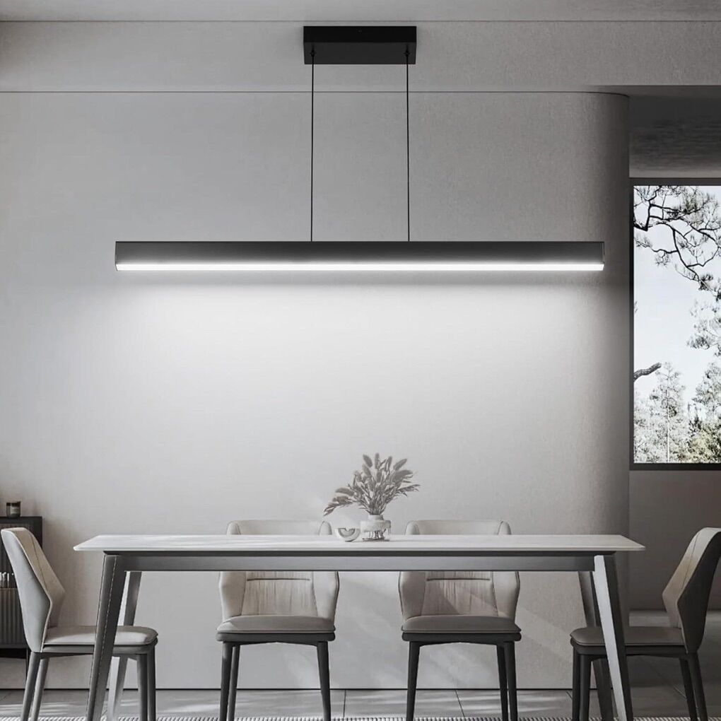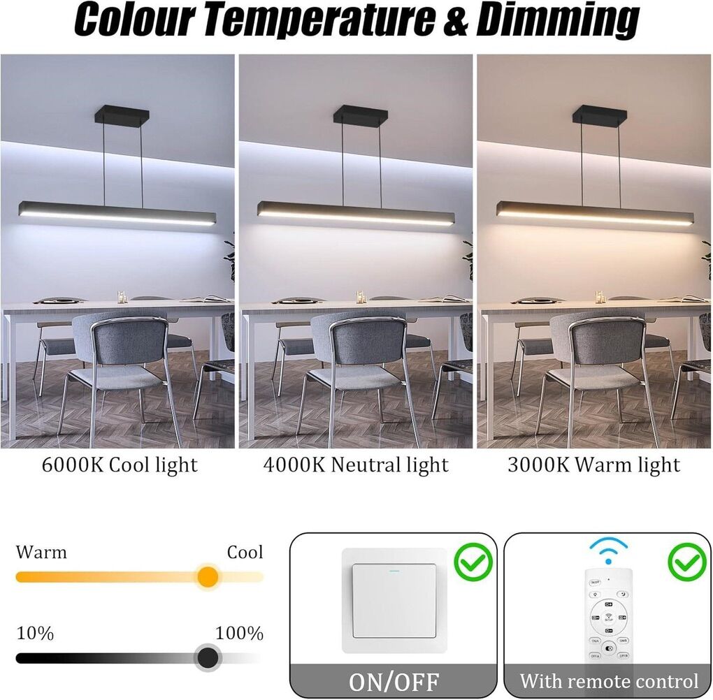 Adjustable Hanging Wire Length: 59inch max. Power: 36W. Voltage: 110V-240V Modern Minimalist Design High quality aluminum body with acrylic lamp shade. Hanging pendant light fixtures are widely used in dining room, kitchen island, living room, study, bedroom, bar and so on. Dimmable and 3 Color Temperatures The modern LED chandelier can be turned on/off by a switch.