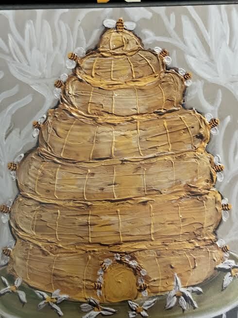 VenmoNancy Thomas “Bee Hive Cake” on green floral cake plate. Folk art. Measures 9”x 6.5” x 0.5”. Wood with metal edging. Yellow cake with bees and white flowers on green floral cake stand. Metal bee on top of frame. Signed. Back hanger. Weight 1.5 lbs. Excellent like new condition.