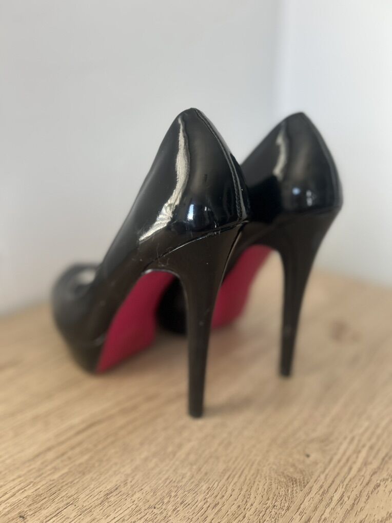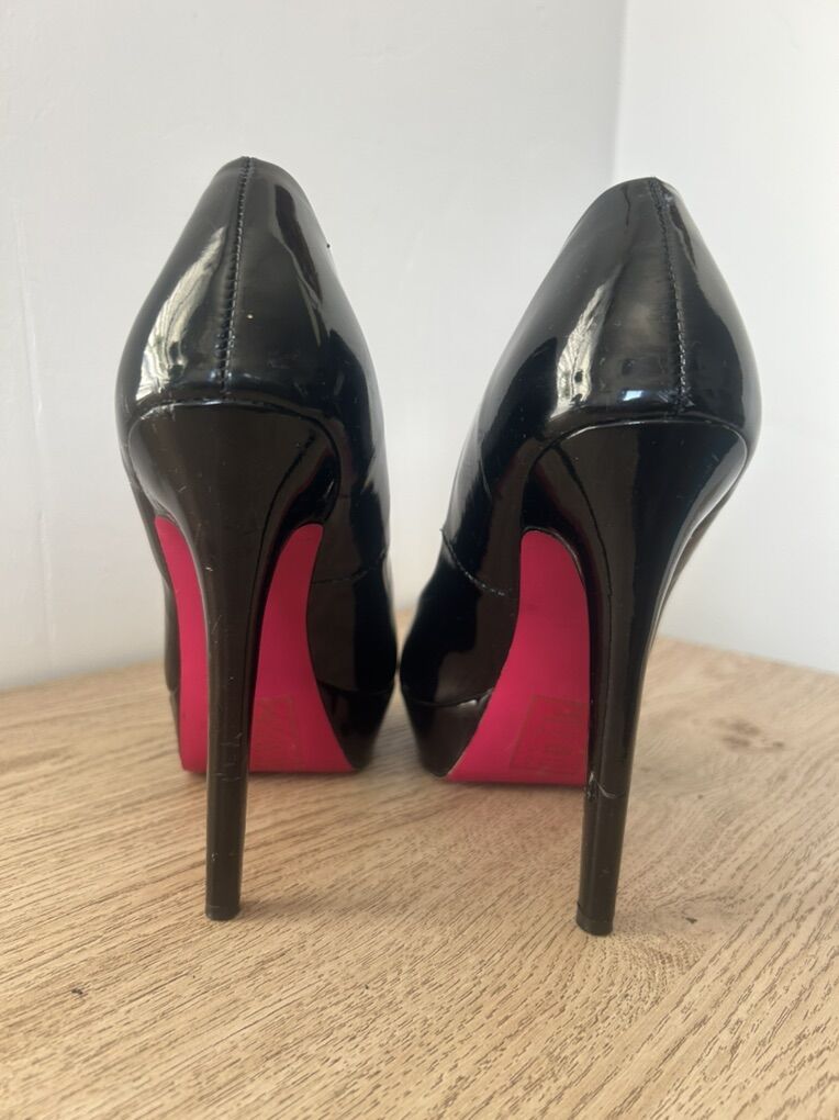 Good condition couple tiny scuffs, but still look very nice. Shiny black heels with hot pink bottoms. Pick up in West Jordan $5