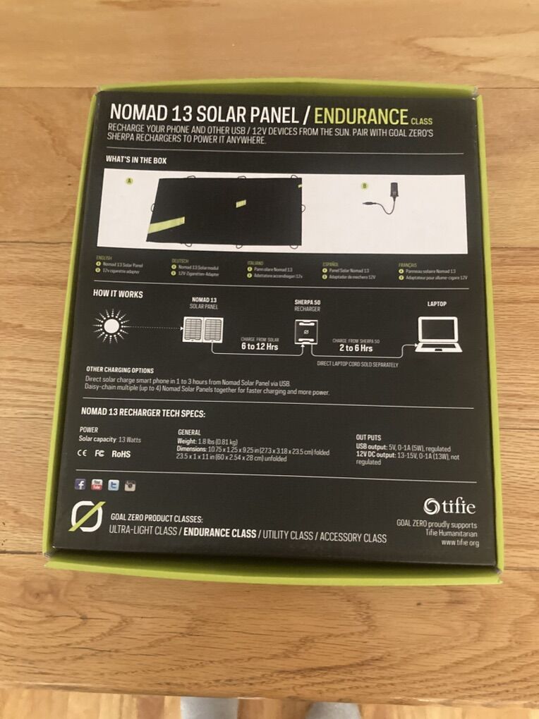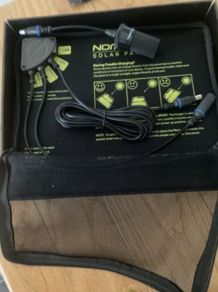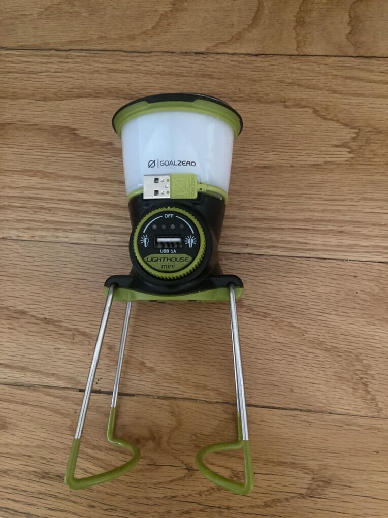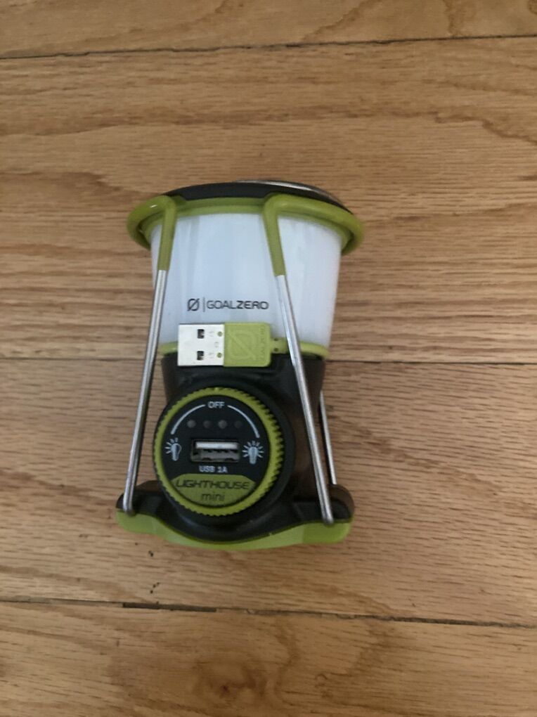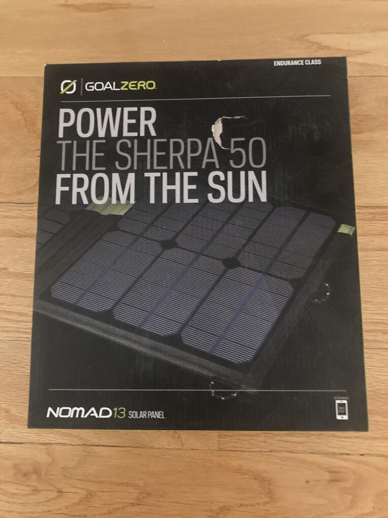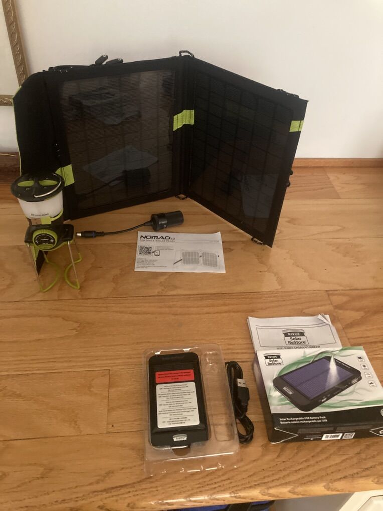 (#1) The nomad 13 charger will accept most USB standard cables for charging. This item was for display in real has never been used. Only has a few hours on it along with the goal zero lighthouse mini lamp. (#2) The lamp does include s rechargeable batteries with it. This is a Goal Zero Lighthouse Mini Lantern in excellent condition. Is lightweight ( great for backpacking ), dimmable and has a replaceable battery. Can function as a powerbank as well. Up to 210 Lumens and 4 hours of battery life The (#3) item, being the Revive solar restore cell phone charger, has never been used and is new with a box .