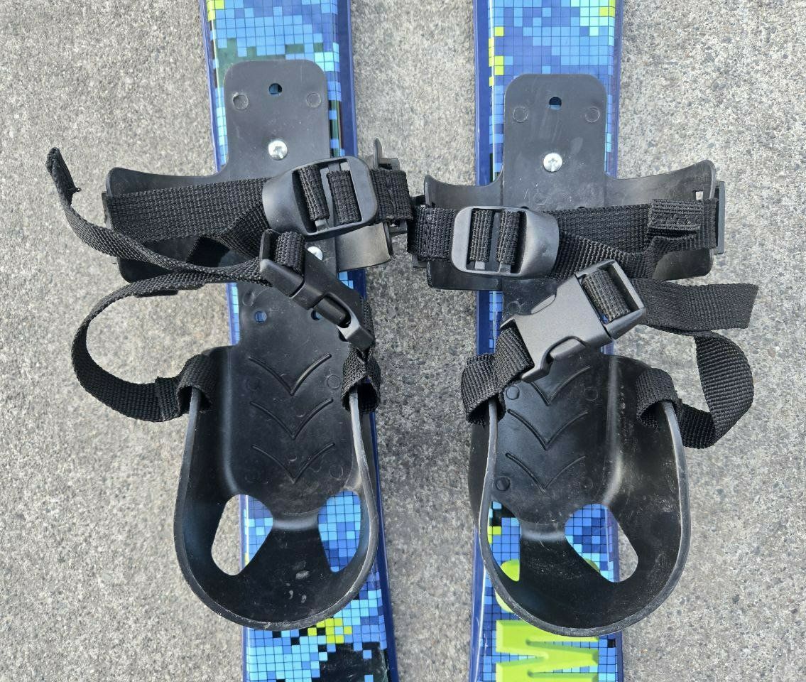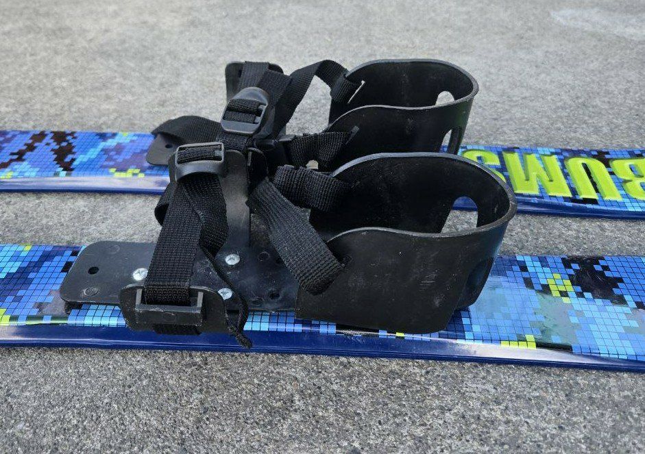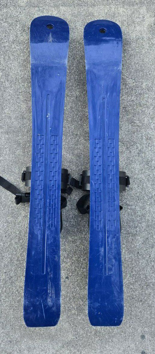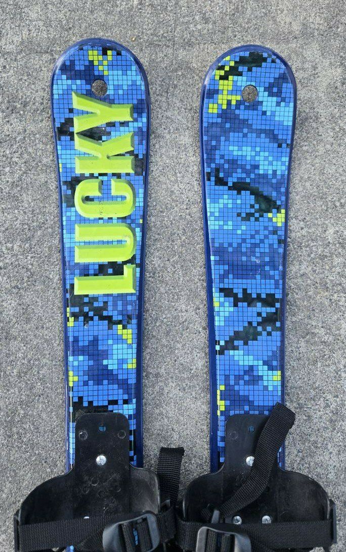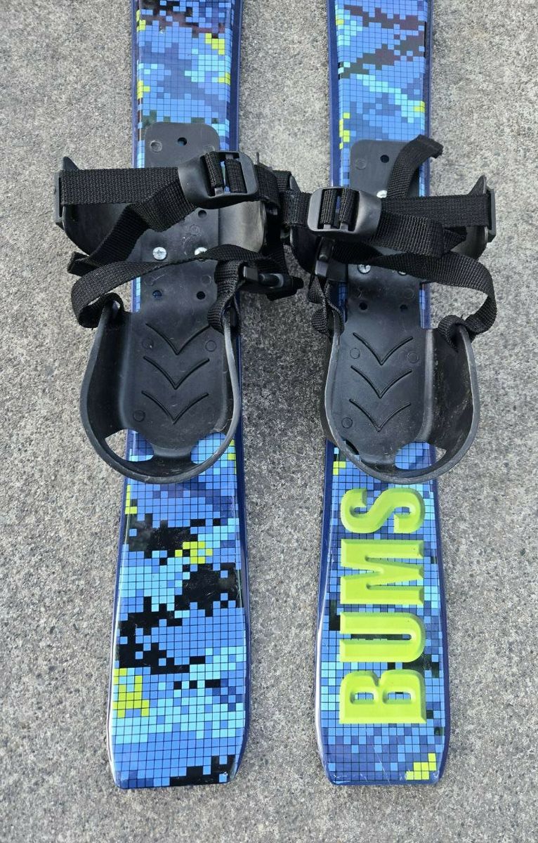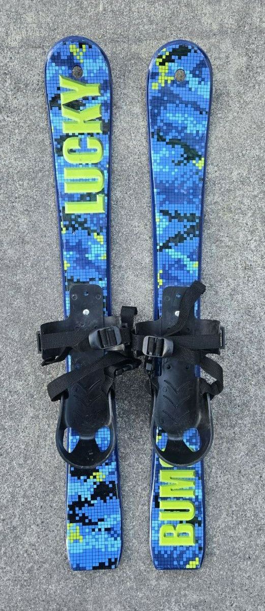 VenmoGreat Blue and Green Lucky Bums Beginner Snow Skis. Good introduction skis for kids 4 and under that you can use with your own boots. They have a rugged design including flexible bindings with attached straps to ensure a secure fit, and scales on the bottom of the skis for added traction. These 70 cm plastic skis enable kids to get used to wearing skis in the snow and become accustomed to the sliding sensation. The bindings allow for heel lift, making these skis with no metal edges the ideal first pair of skis for kids just learning to walk all the way up to 4 years old. Text please!