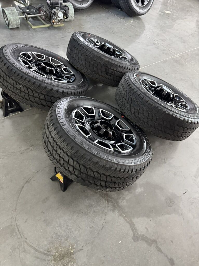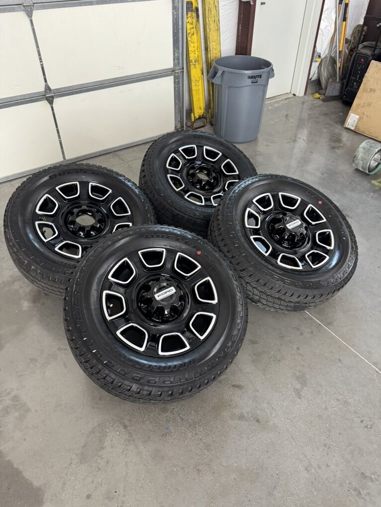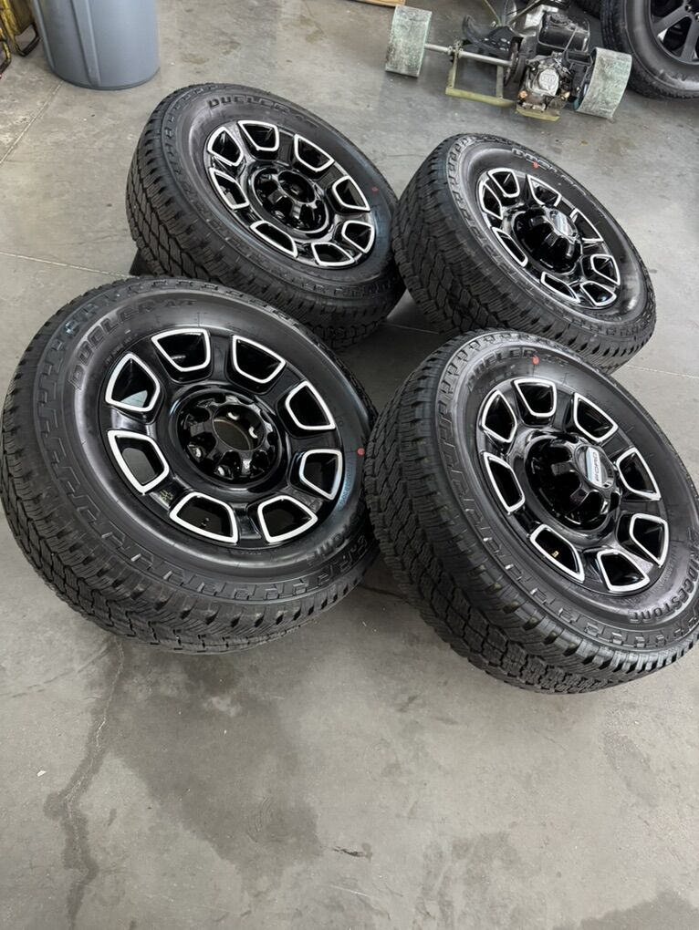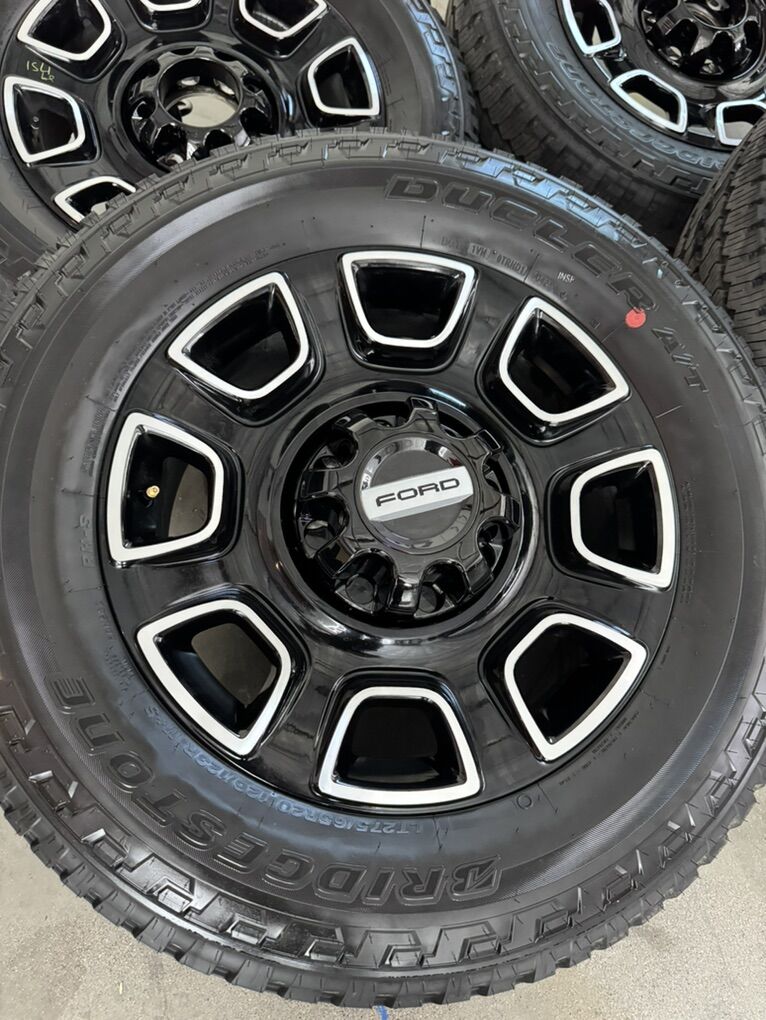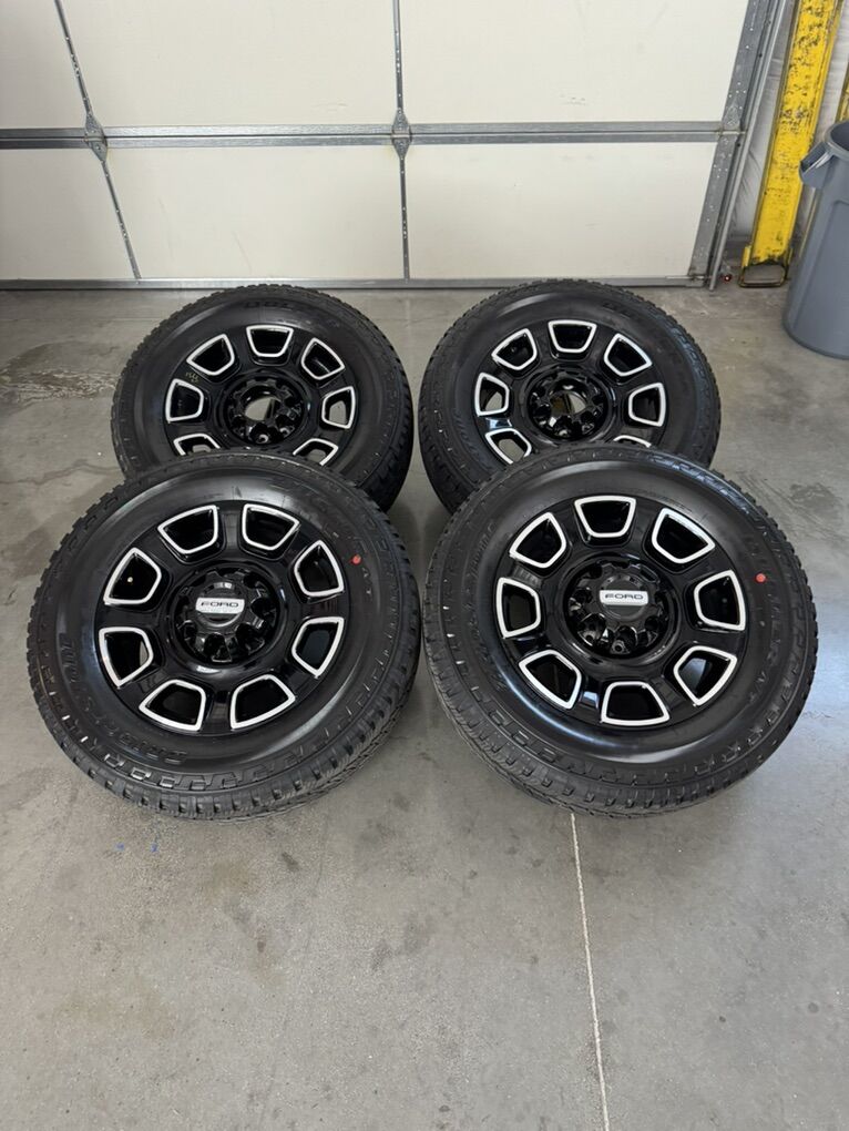 Wheels are 20in OEM wheels off a 2025 ford f350 platinum plus package. Wheels are in perfect condition, they look as if they just came off the assembly line. No curb rash, or damage on them. All then center caps are also included. Tires are 275/65/20 Bridgestone dueler all terrain, load range E, top of the line, great riding and performing tires. No patches or plugs. Tires have less than 50 miles so they are basically brand new.