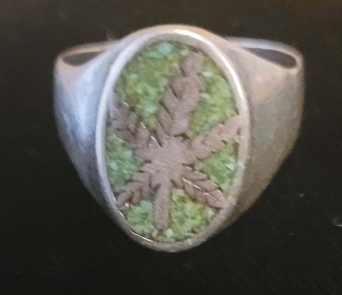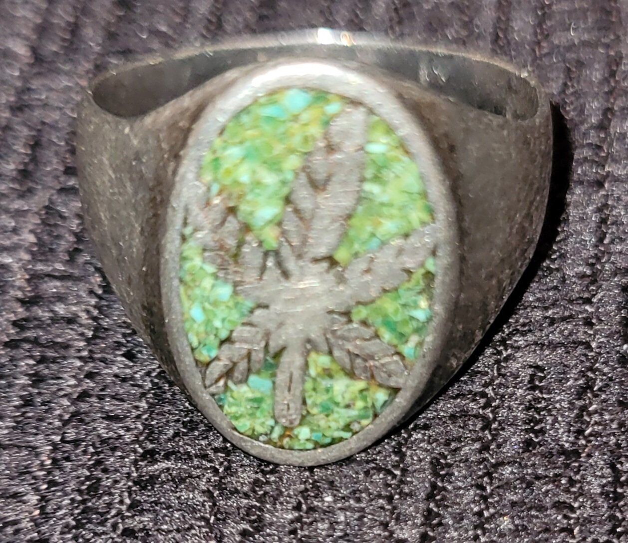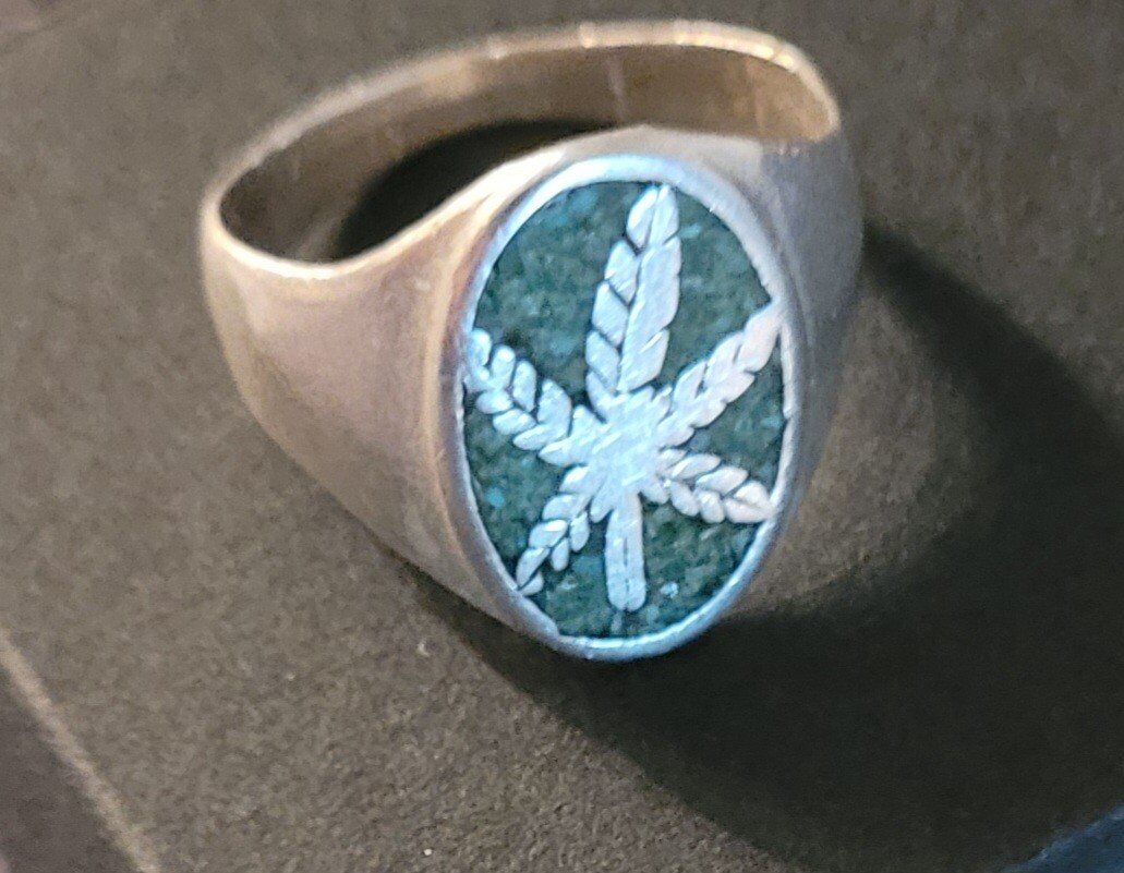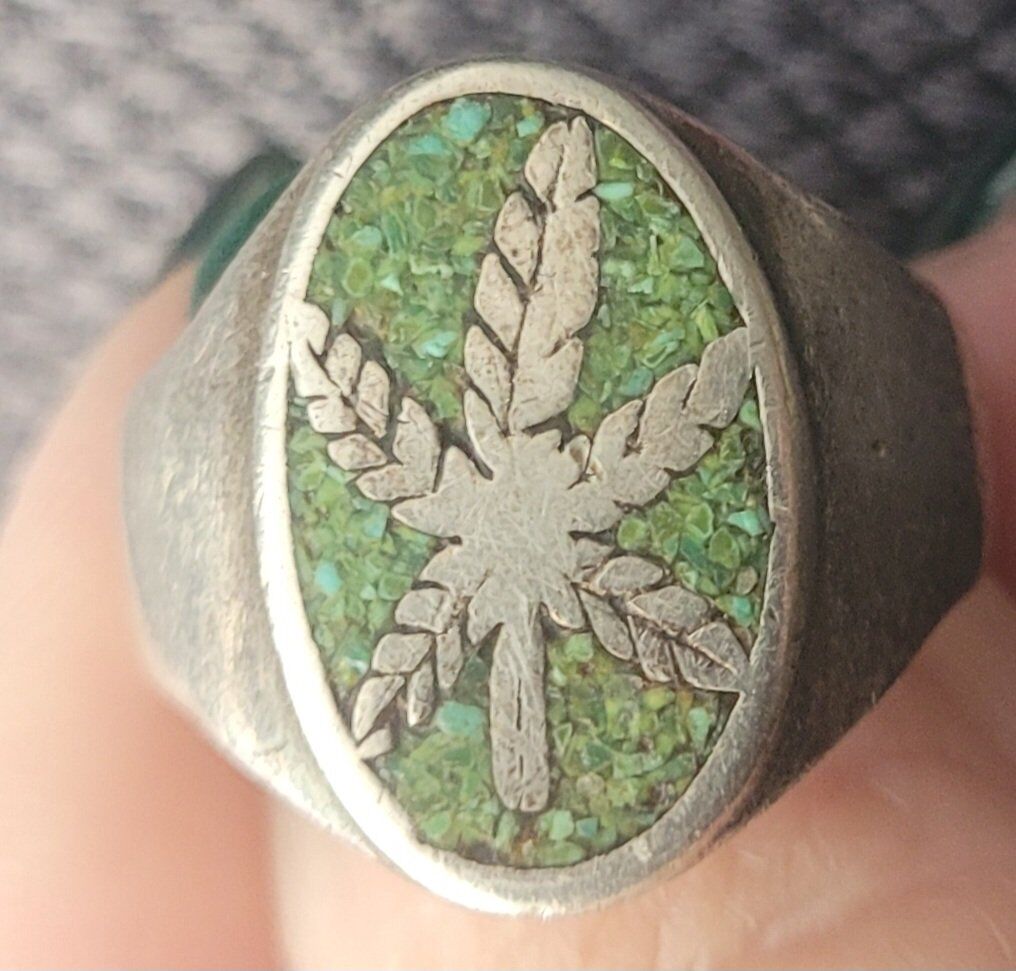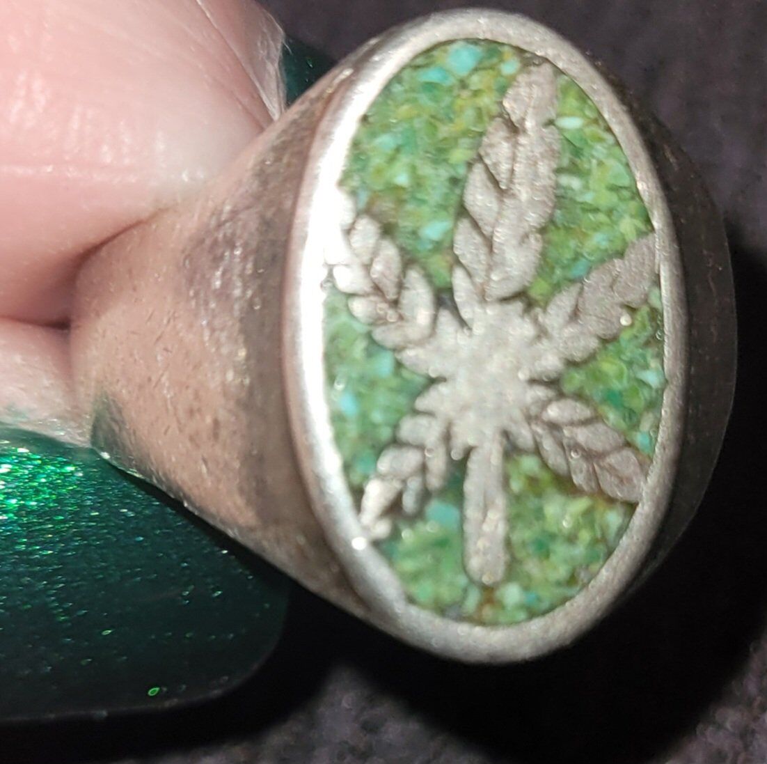 Vintage Sterling Mexico Marijuana Leaf Ring Crushed Turquoise Signsize 9 1/4