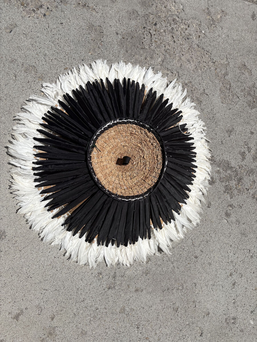 Venmo26" round White Juju hat, boho room decor, dyed chicken feathers wall decor $40 cash/venmo in Draper