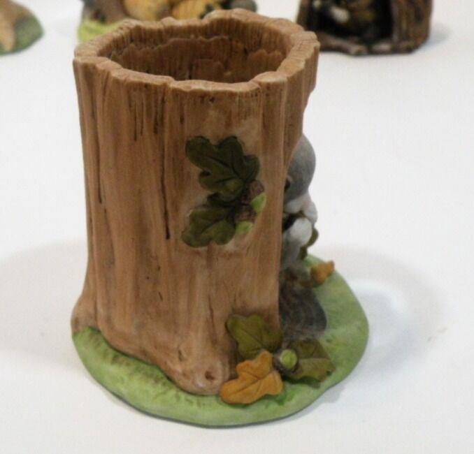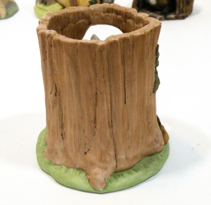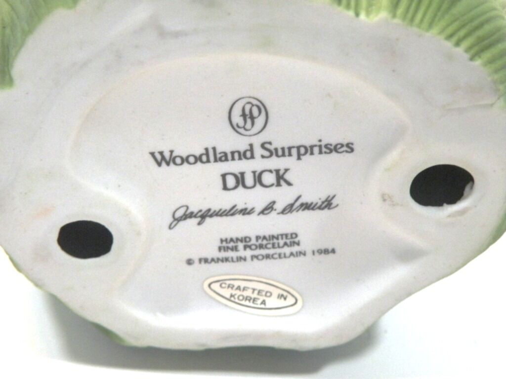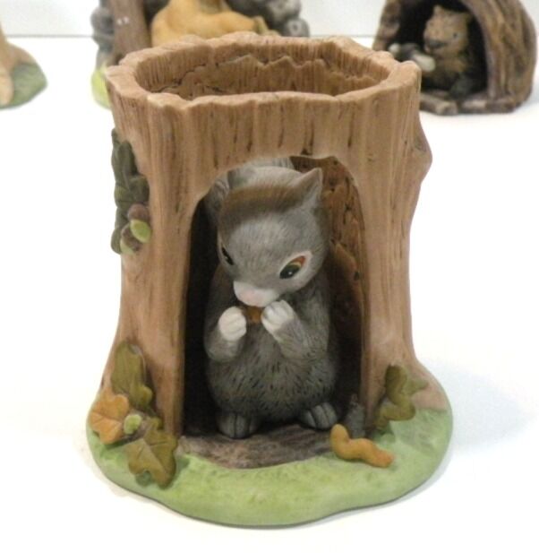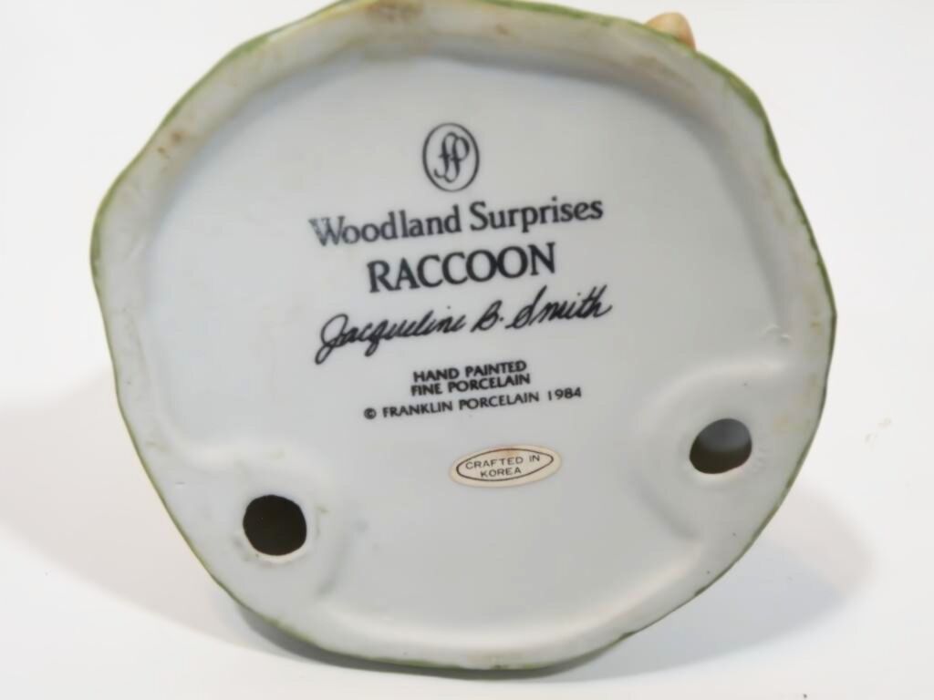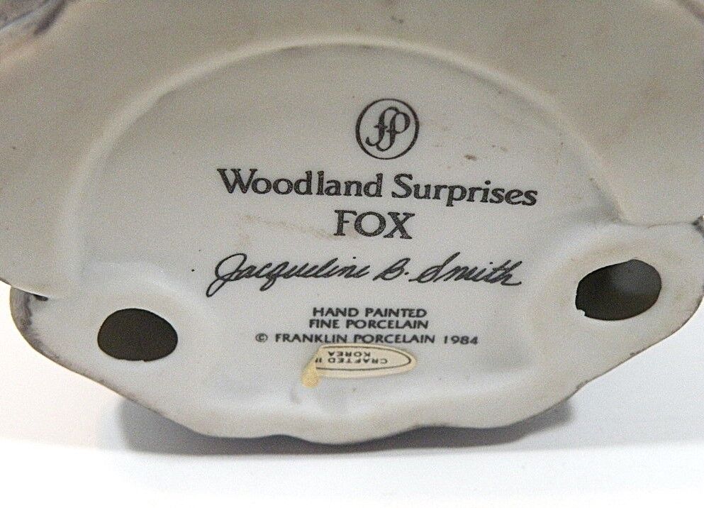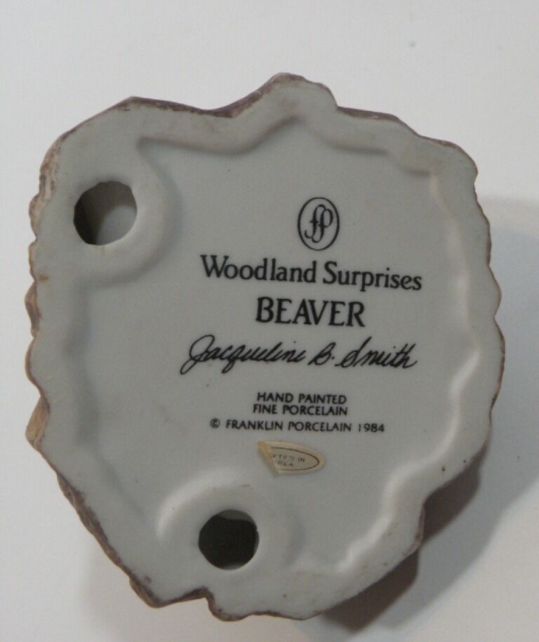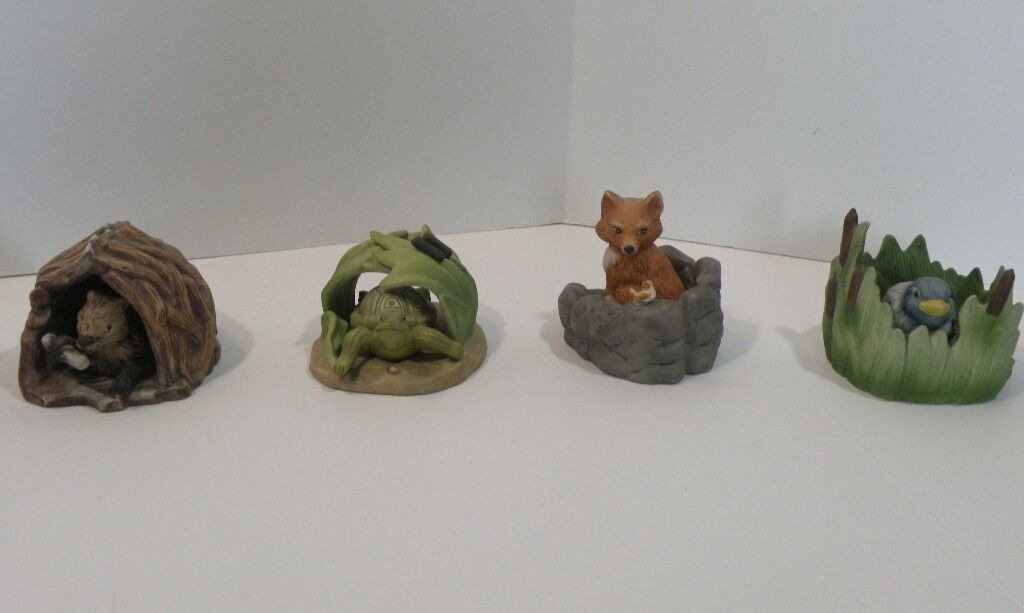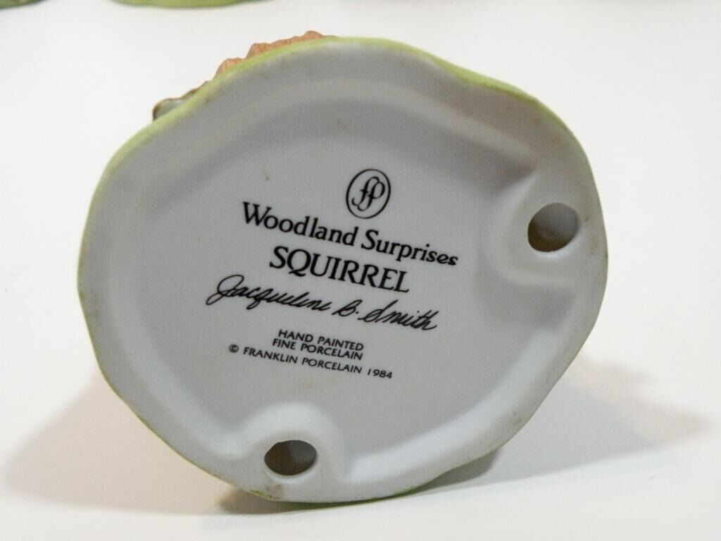 Adorable Retired "Woodland Surprise" Hand Painted Porcelain Animals with Habitat. Retired from Franklin Mint. 1984. These are absolutely adorable and each one comes in their own home. Each one is signed and dated. Jacqueline B Smith special collection just for the Franklin Mint. The details are exquisite and real like. Each one is approximately 4X6. There are 8 of them all together. Bear Cub in a cave with a jar full of honey with bees. Fox in a den Beaver in a dam Turtle in the grass cove. Raccoon in a tree stump Bird in a nest Owl in a tree Squirrel in a tree trunk. They are all hand painted and very detailed in every aspect. If you like baby animals and need something to brighten up your collection these are definitely for you. They sell at replacements .com at 40 each. So this is a super deal for all eight.