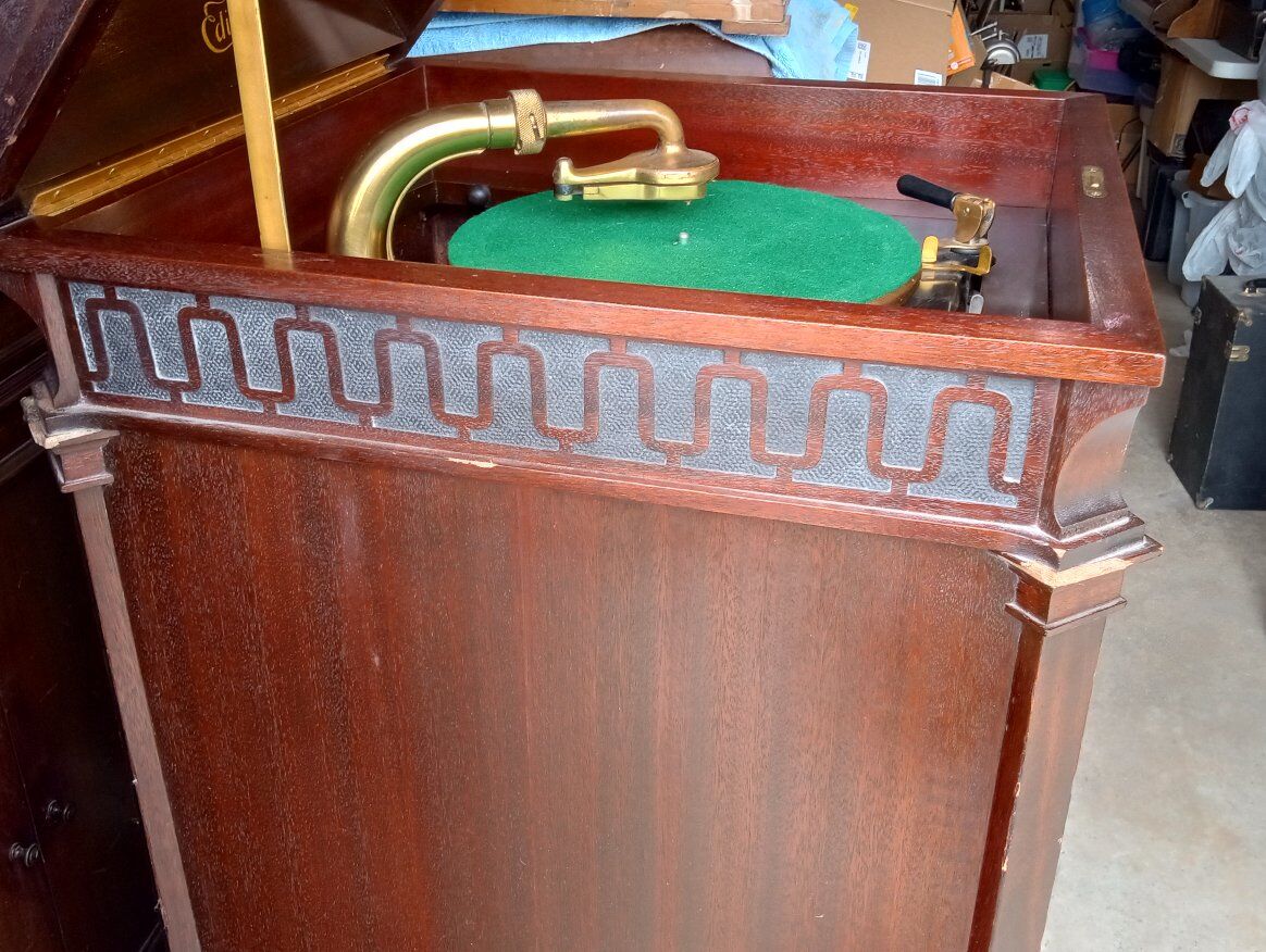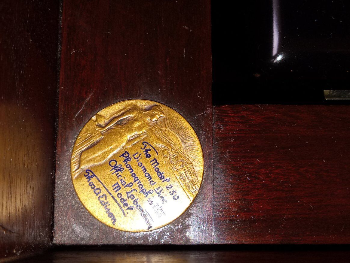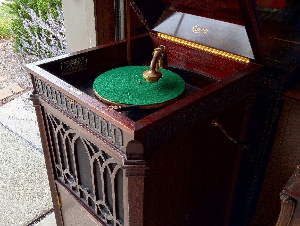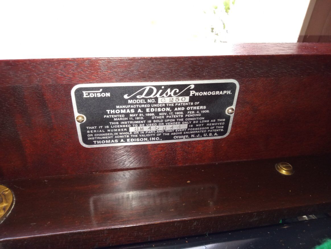 Antique Edison Diamond Disc Phonograph Model C-250, Official Laboratory Model (Serial No. SM 45844). Excellent working condition with minor cosmetic chips and scratches. Features gold-plated tonearm, reproducer & crank, two pull-out record drawers, and a sturdy mahogany cabinet with ornate detailing. Plays beautifully and includes 5 Diamond Disc records. Local pickup only in Sandy, Utah.