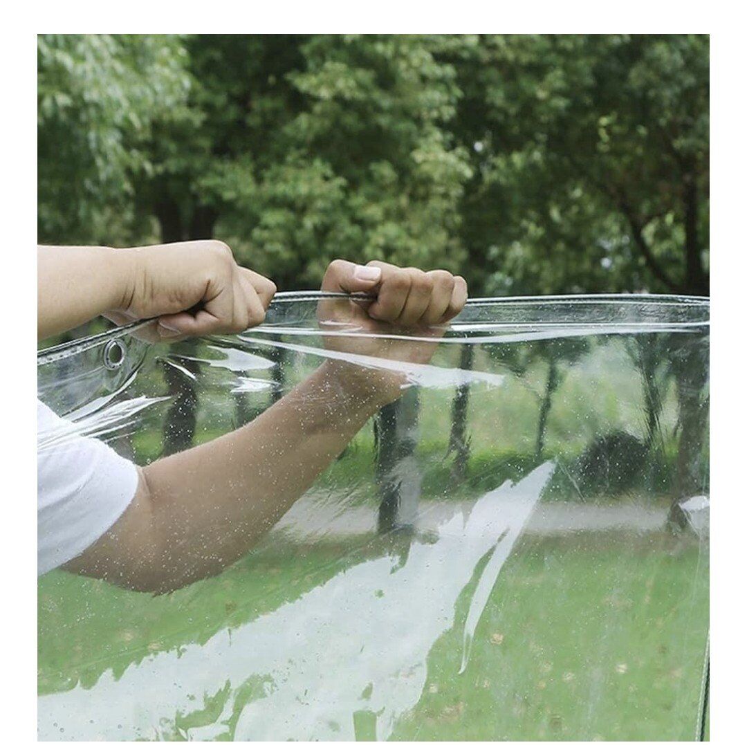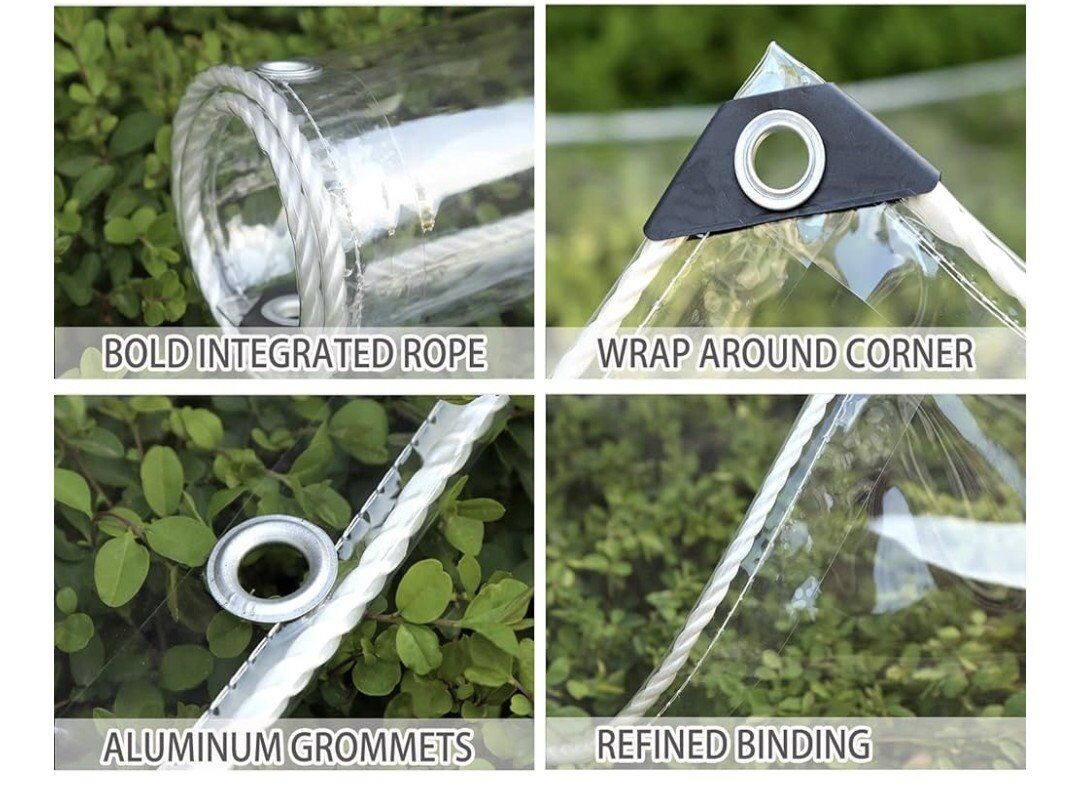 1.88x2.5 meters 6x8feet approximately New, black rope uncluded. Transparent thick PVC tarpaulin thickness 0.35mm, hole diameter 2cm; metal hole spacing 50CM, carrying rope. Double-line wrapping design, seamless splicing, tear resistance, and long service life. Good Light Transmission, The clear heavy-duty tarpaulin is 99% transparent and will not block the view or affect the light in the room. The tarpaulin isolates the external factors and ensures that the plants have sufficient sunlight. Heavy Duty Tarp Protector The dust tarp can be suitable for both indoor and outdoor areas. Great for swimming pools, patios, porches, gazebos, plant conservatories, rooftops. It is waterproof, rainproof, sunscreen, durable antifreeze, easy to clean and other multi-functional tarpaulins. Reinforced metal groomets, the PVC tarp is designed with loop buckles on 4 corners, which can tie or fix the tarp firmly to your valuables even in strong wind or heavy rain.