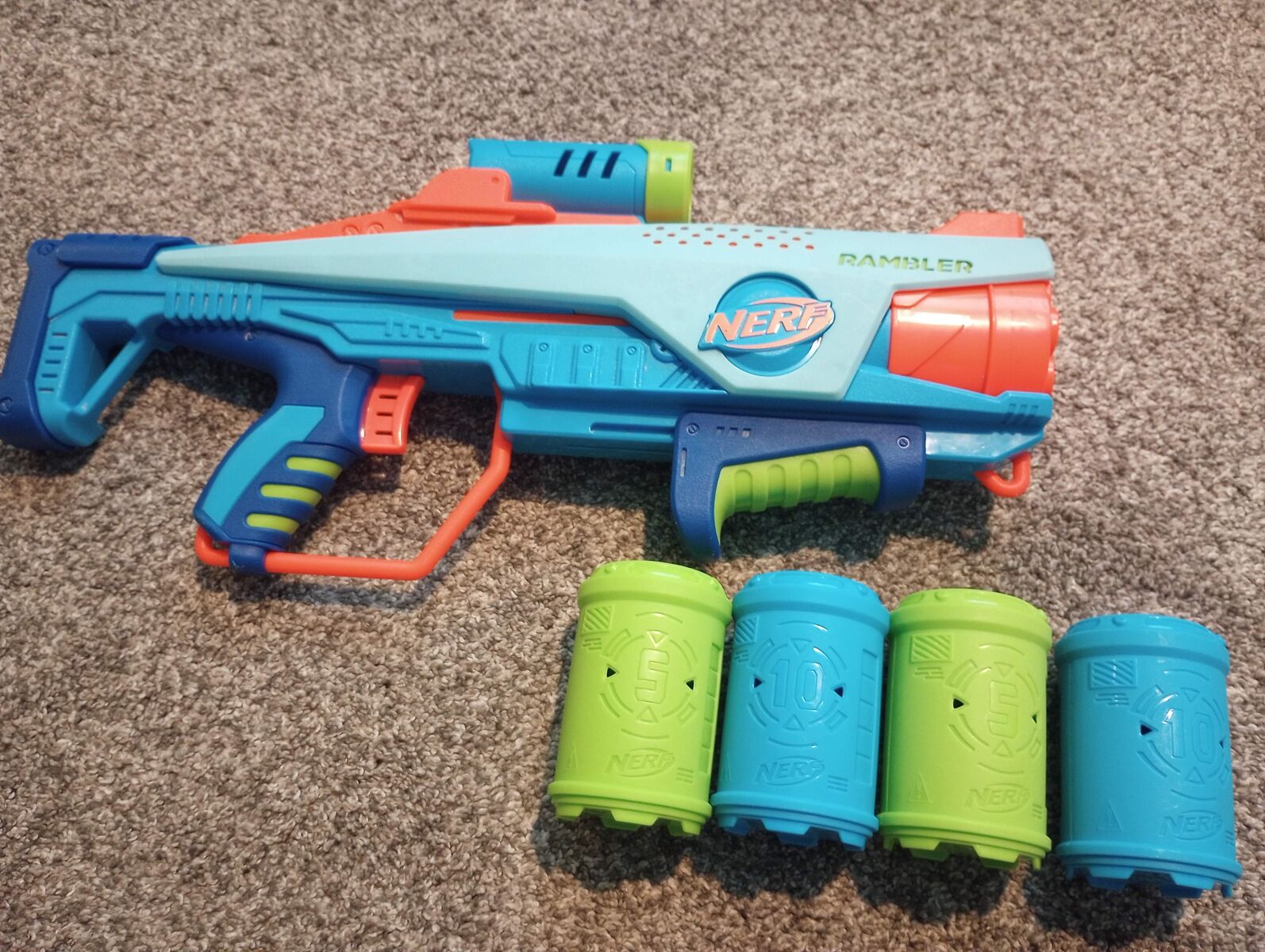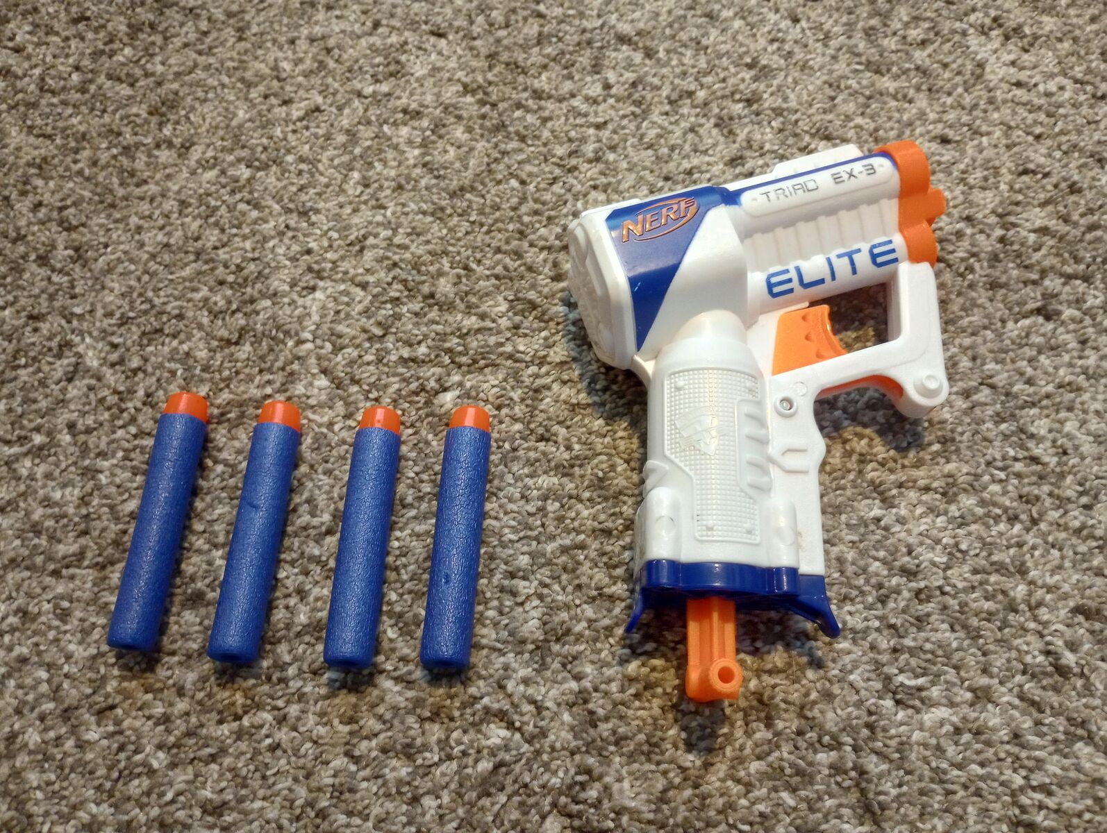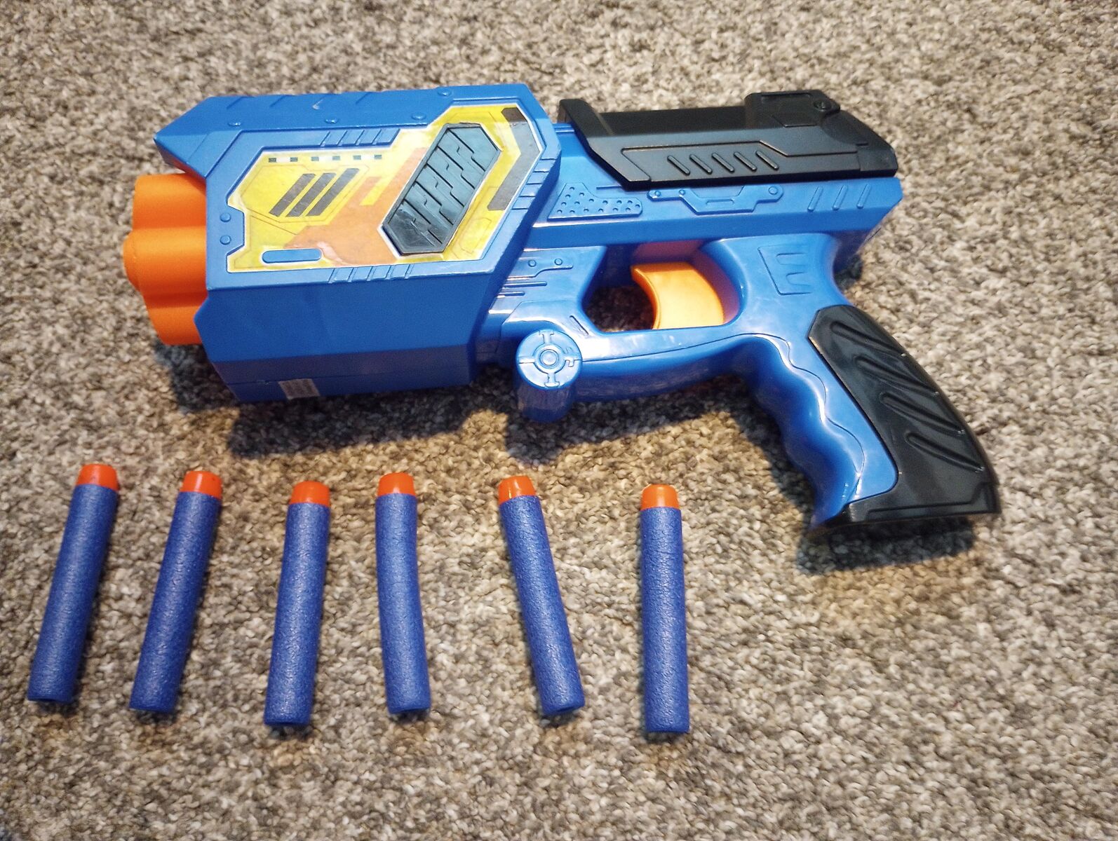 VenmoVarious Nerf guns with ammo: Elite Triad (white one) $3 - 3 bullets Six shooter (dark blue one) $5 - 6 bullets Captain America Sheild $5 - 18 bullets Rambler with targets (multi-blue one) $10 - 30 bullets Mega RotoFury (red one) $10 - 40 bullets Elite 2.0 Shockwave $10 - 23 bullets All guns come with ammo. Buy individually or all 6 for $10.