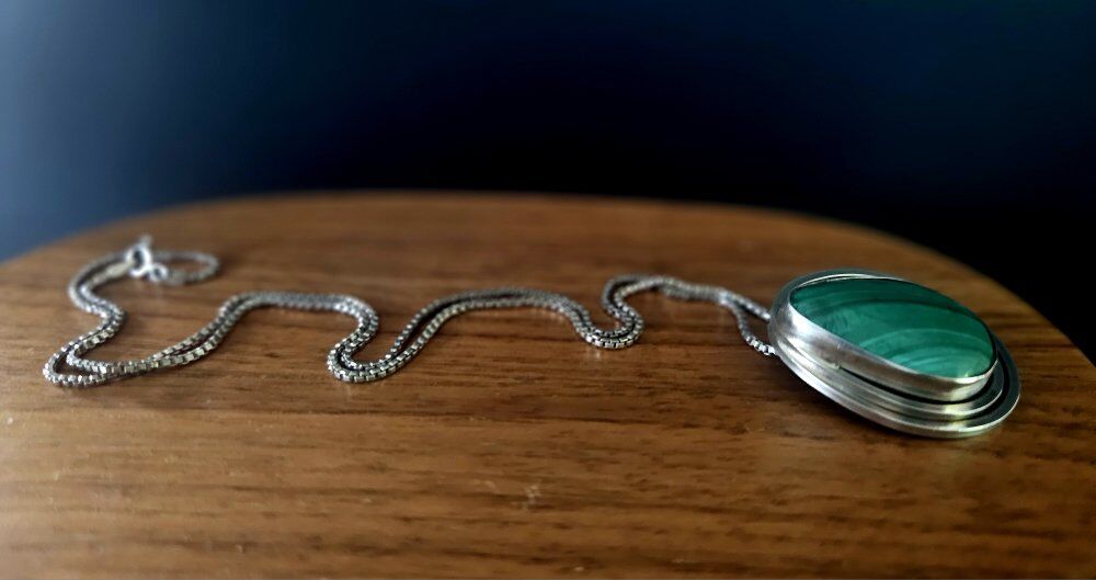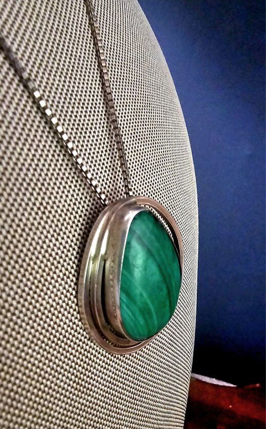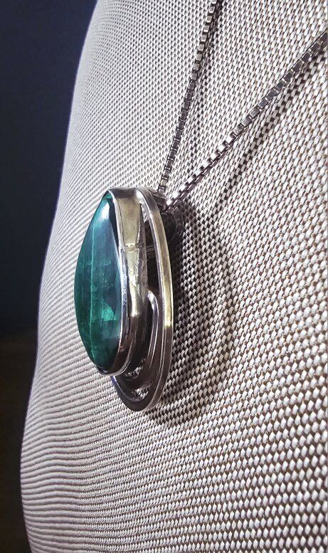Very vntg Art Deco style Sterling Silver and green TEAR shaped MALACHITE stone 1.5" PENDENT & BROOCH!! Marked 925 and comes with an 18" ITALIAN SS Box Chain. Brooch pin and closure in great shape & works as it should.