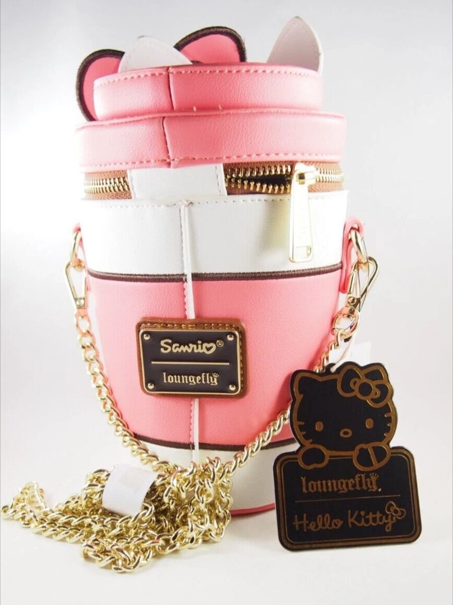 Brand New in original packaging! A very cute, Hello Kitty structured Pumpkin Spice Latte crossbody bag featuring gold detailing and in the shape of a coffee cup. Two white ears and a pink bow decorate the top. Has a gold chain for the strap.