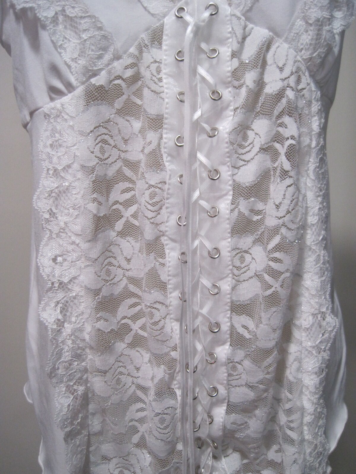 This Lace Eyelet Camisole in white floral design is a stylish and versatile piece for women, perfect for both casual and party occasions. The sleeveless V-neck camisole features a pullover closure and delicate lace accents, with adjustable spaghetti straps for a comfortable fit. Made of polyester with a lace fabric type, this top offers a breathable and stretchy feel, making it ideal for the summer season. The camisole is in size small, suitable for a regular fit for women looking for a trendy and flattering top.