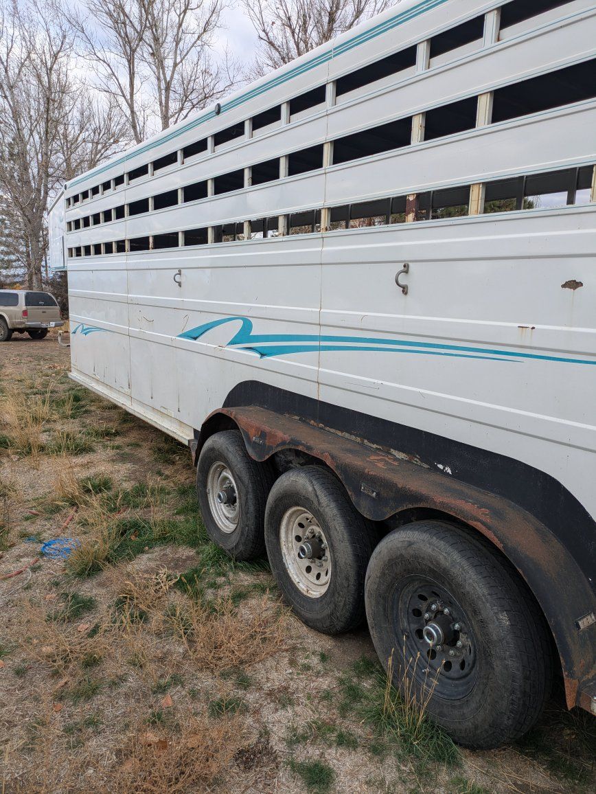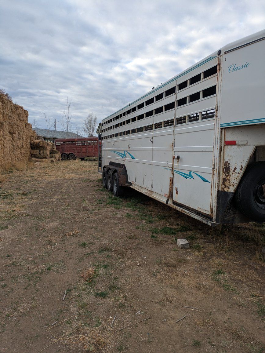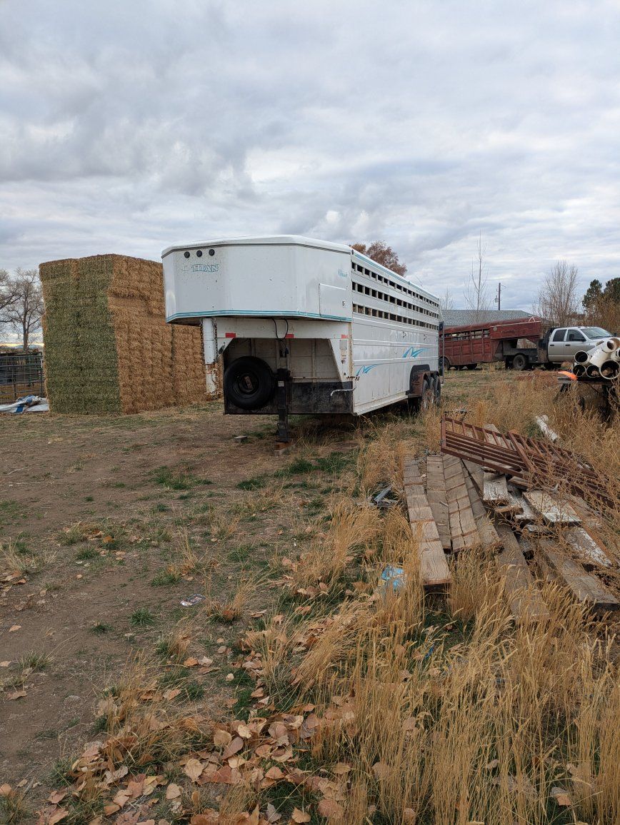1999 titan stock trailer. 28 foot floor by 6'8" width. Extra tall inside height. Has 7 new tires, all 6 wheel ends have new backing plates, brakes, magnets, wheel bearings, drums and hubs. Brakes work. Has all new lights. All new wiring. New junction box for wiring. New floor. Reinforced the entire lower section of the box to the frame. Everything works. 2 cuts for 2 10' compartments and 1 8' compartment. Just took to northern California with a load of bulls and it pulls great. Has interior lights with a switch. Message or text 435-704-4349 with questions or offers