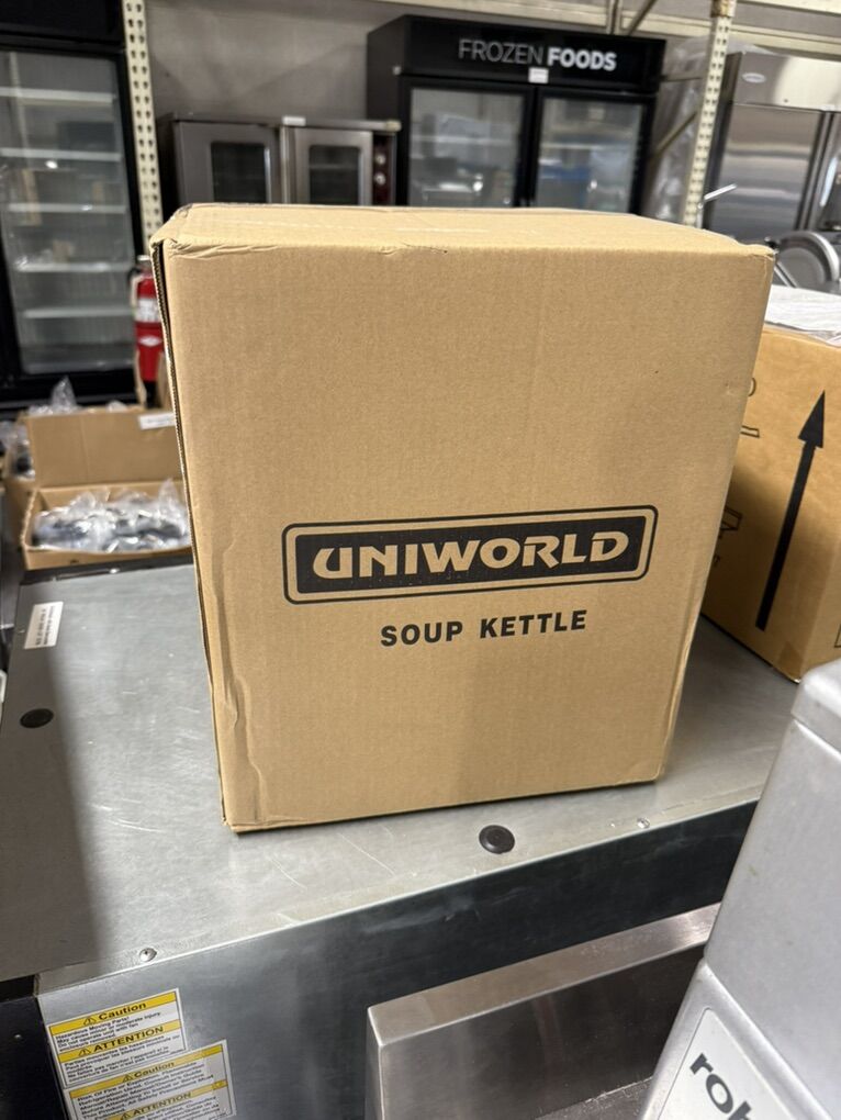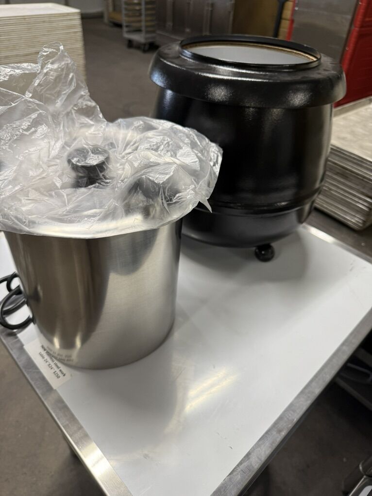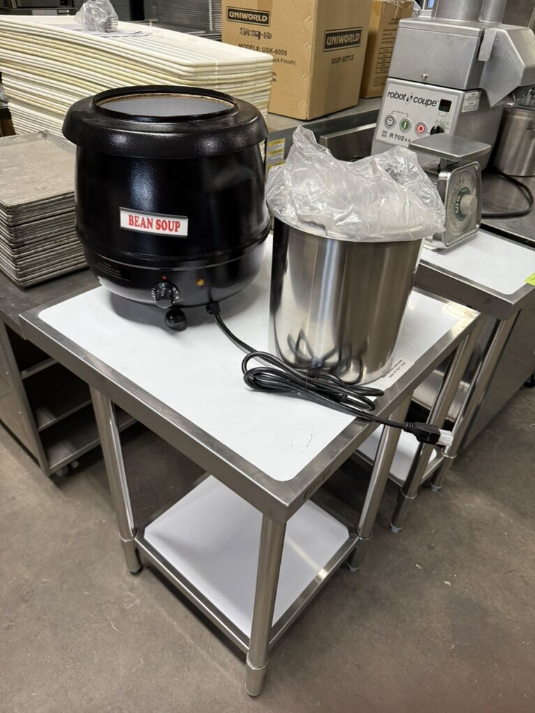New electric soup kettle Holds 10.5 quarts liquid with stainless steel inner pot , adjustable temperature Control to soups , sauces , and stews warm at desired Temperature . 115 volts
