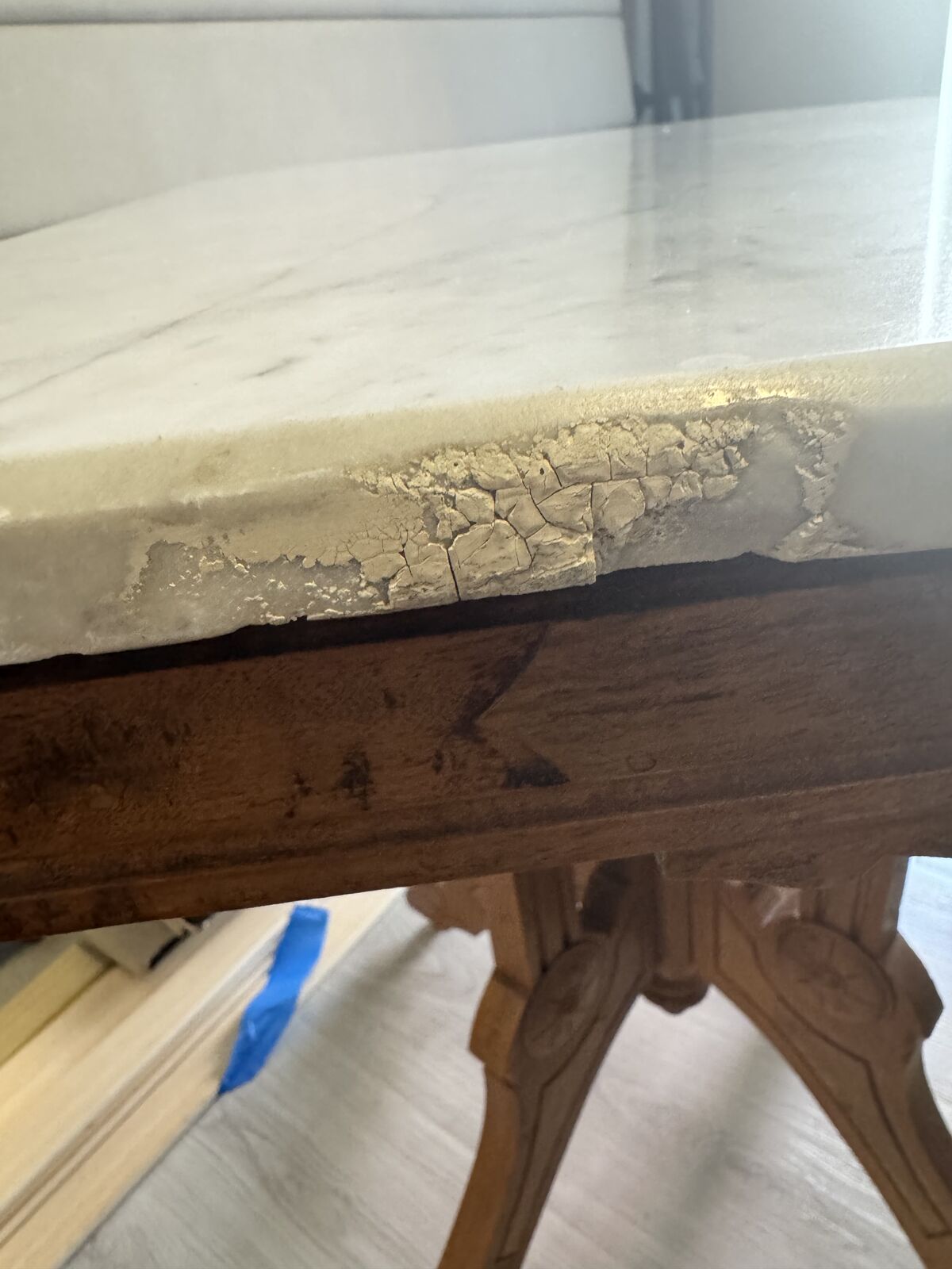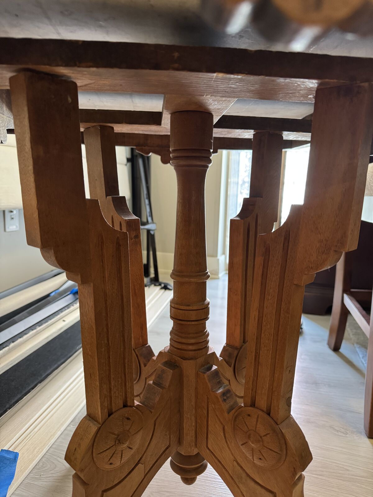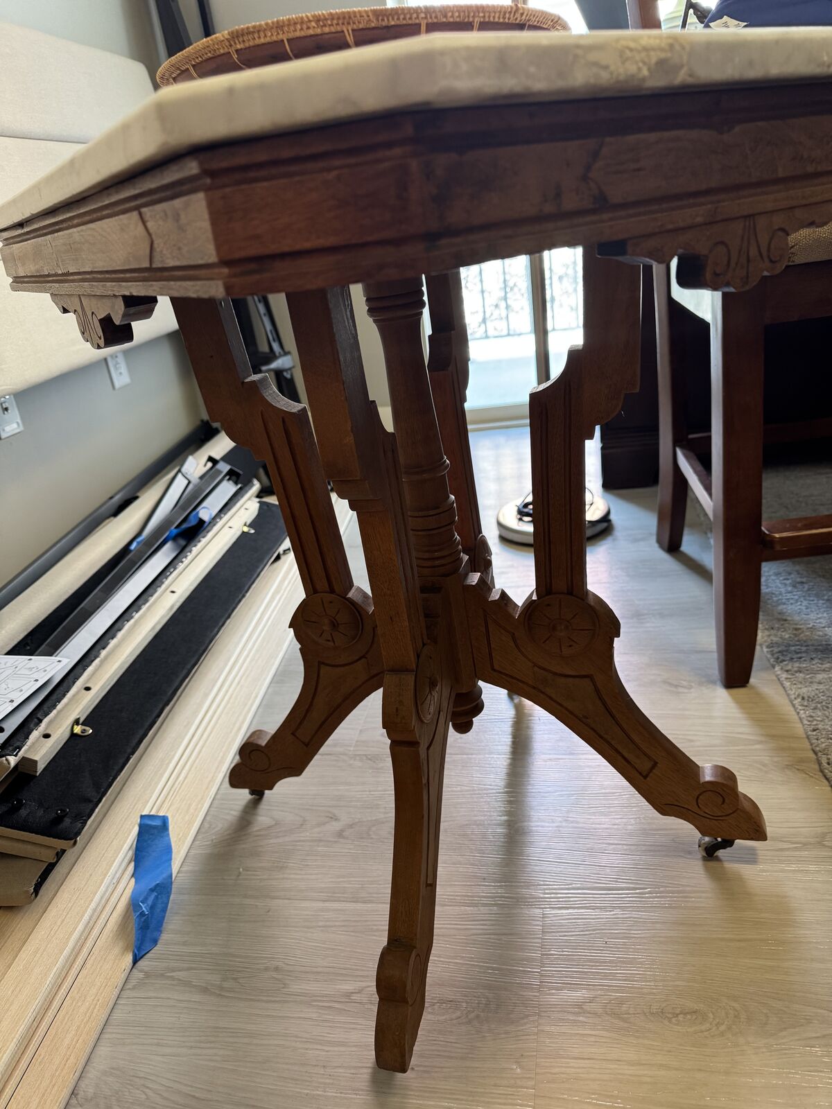 ZelleREduced from $425. Wonderful antique eastlake table; porcelain castors; light ring on marble and one rough edge. Wonderful condition--consistent with age. Must see. Serious offers considered. Table is 30 long, 22 wide, 28 3/4 tall.