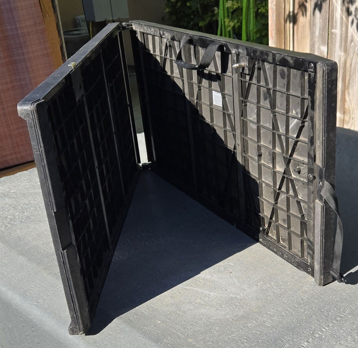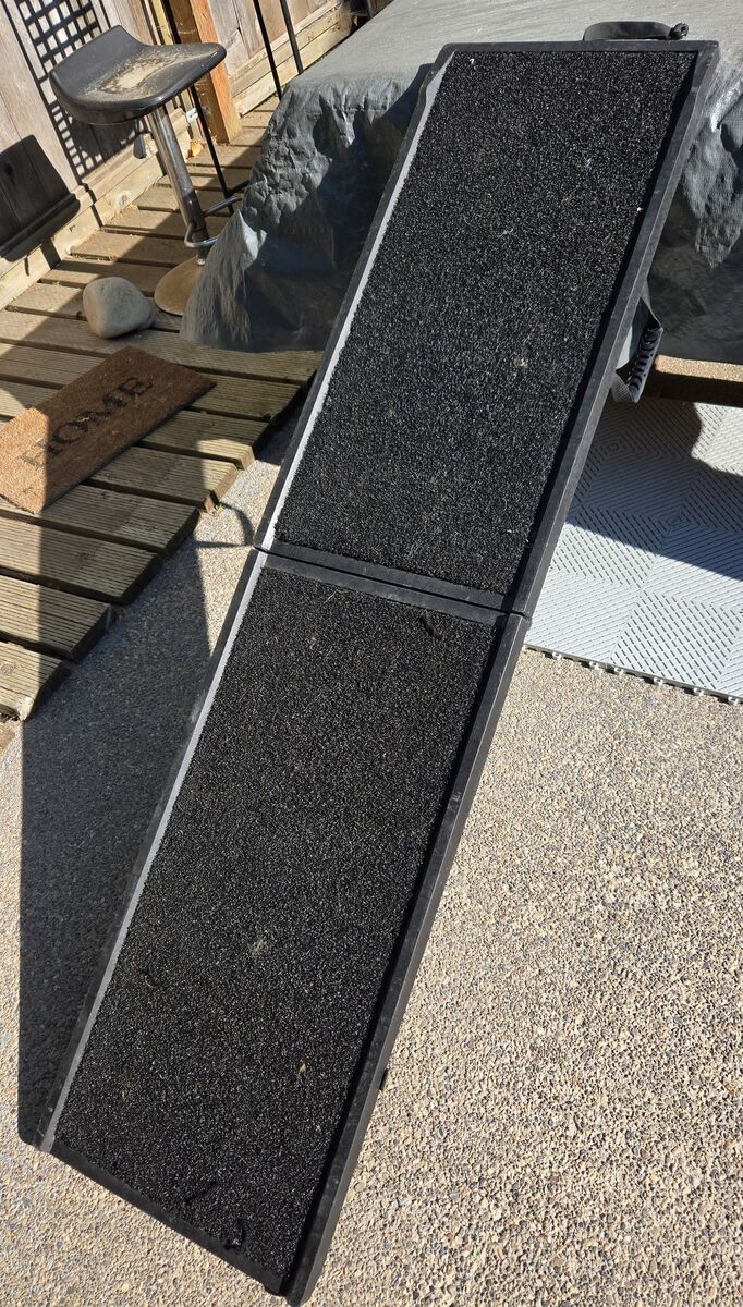 ZelleThis is a very nice, very heavy duty, pet ramp that is 6 feet long opened and 18 inches wide. It has metal hinges, a carry handle and a top strap that could be used to hold it in place. This type of ramp is great especially for SUVs and taller vehicles or levels that are higher up as it is easily climbed at any level due to no steps. Quite heavy due to the construction making it more sturdy. Pick up in Heyburn, no shipping. Call if you have questions.