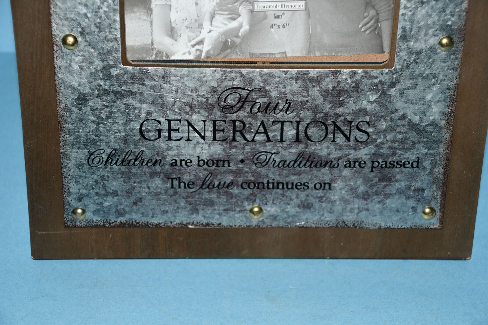This NEW "4 GENERATION" PICTURE FRAME is WOOD & GALVANIZED METAL. It holds a 4" x 6" PICTURE. It is 10.5" x 10.5". Our home is smoke free. Questions??? Please ask. We are located in Plain City. Cash only please.