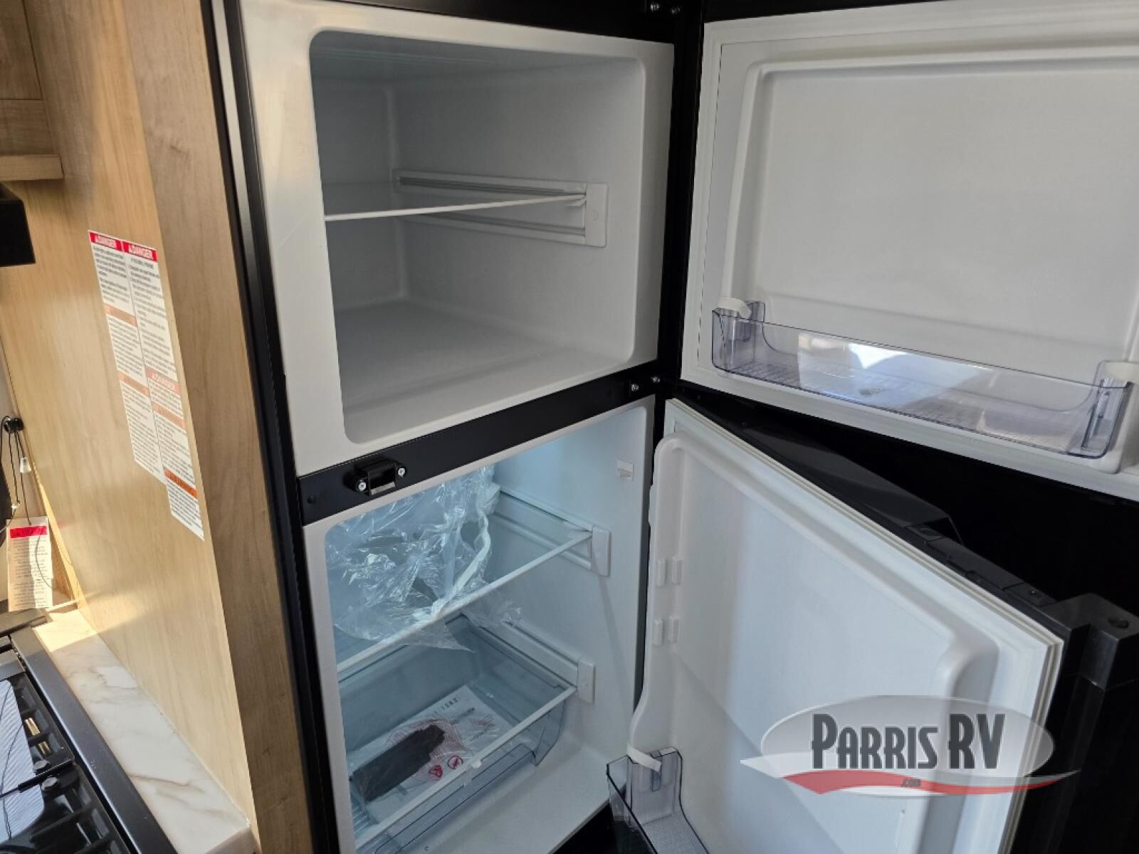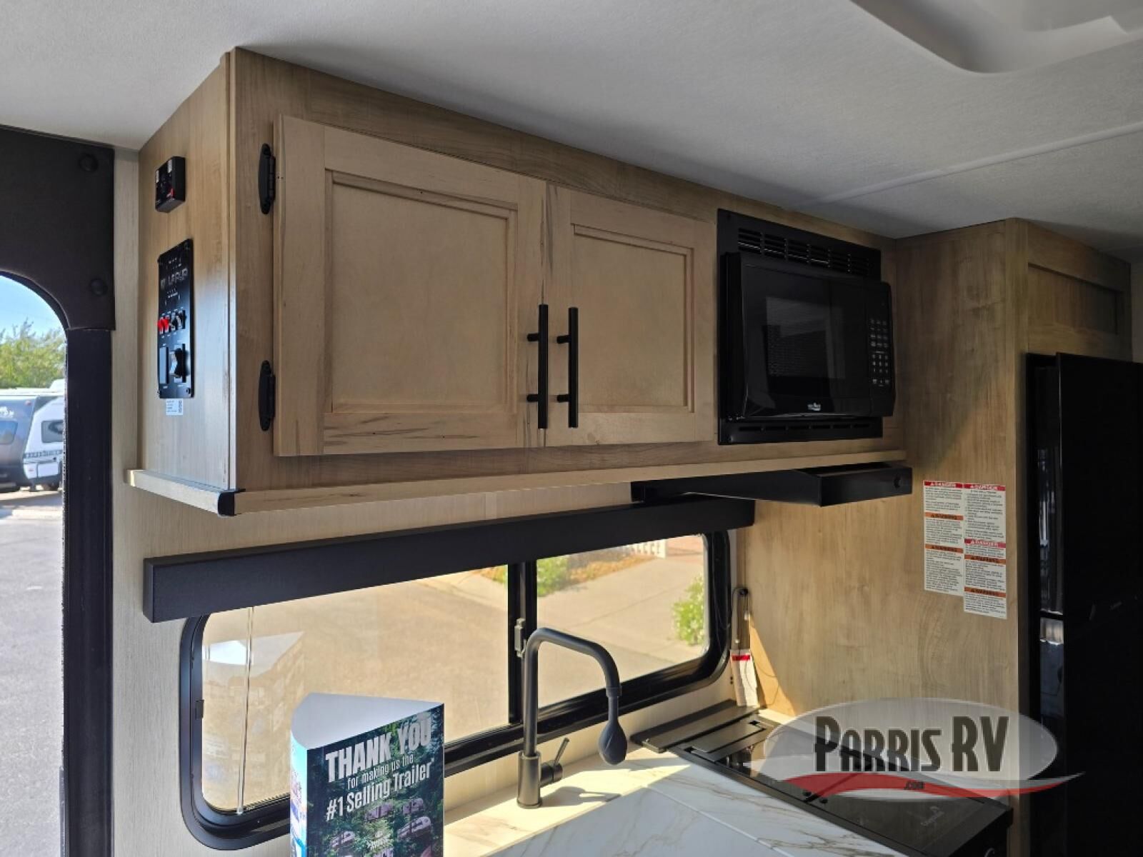 The whole family can sleep comfortably in this travel trailer! It has a set of bunk beds for the kids to sleep on, and you can sleep comfortably on the front queen bed with overhead cabinets and a shelf. There is even an exterior storage plus door that accesses the storage space under the bottom bunk. The chef will enjoy preparing their best home cooked meals either indoors with the high output cooktop or at the outside mini kitchen while staying protected by the 12' power awning!