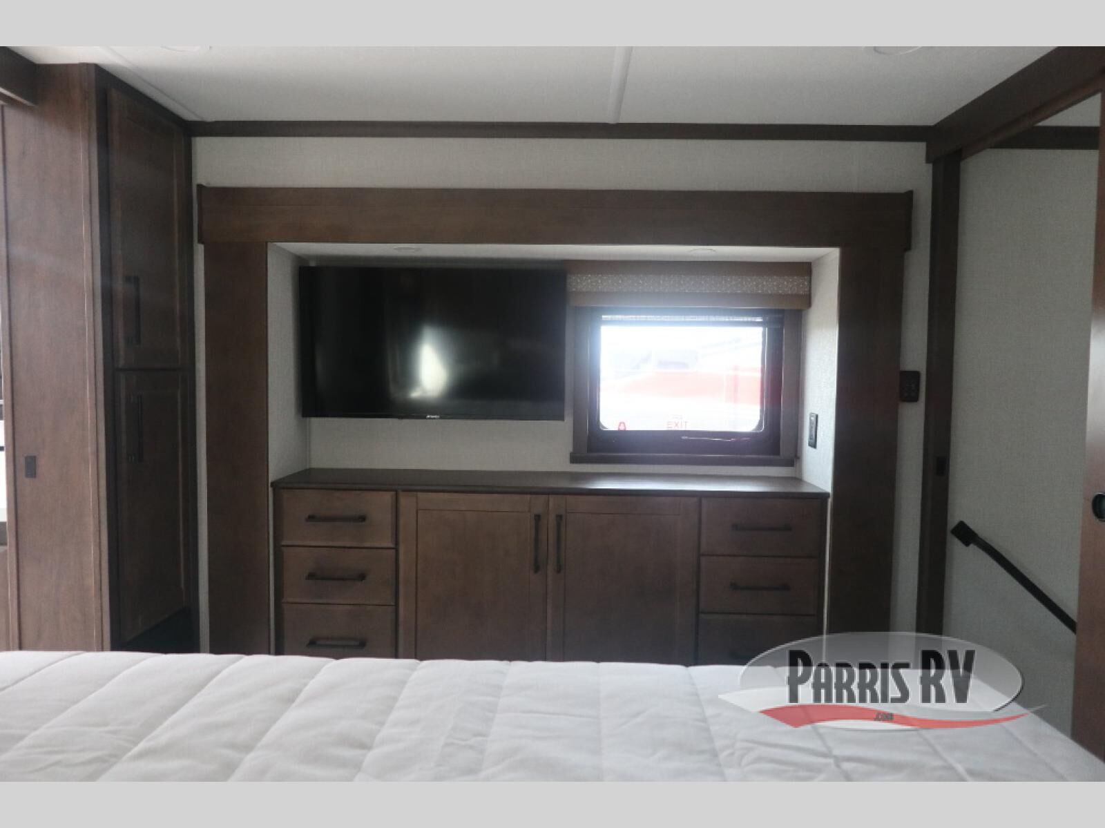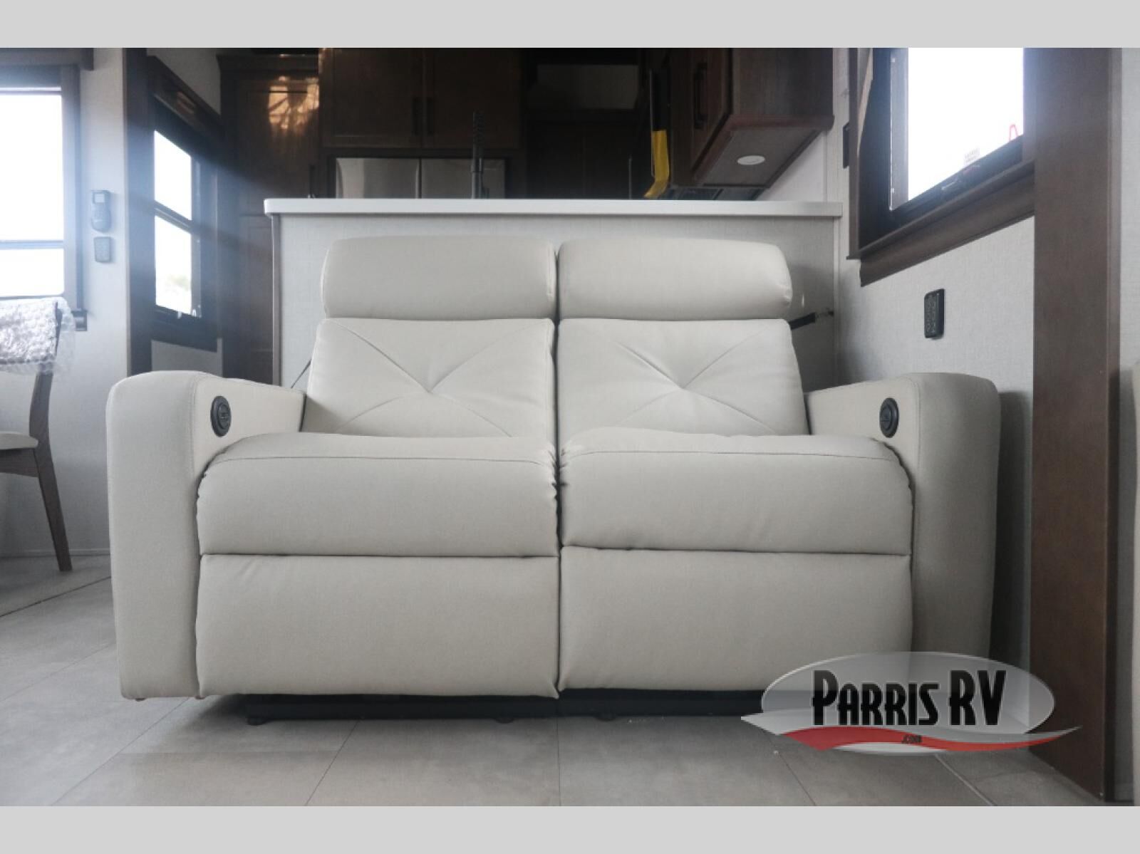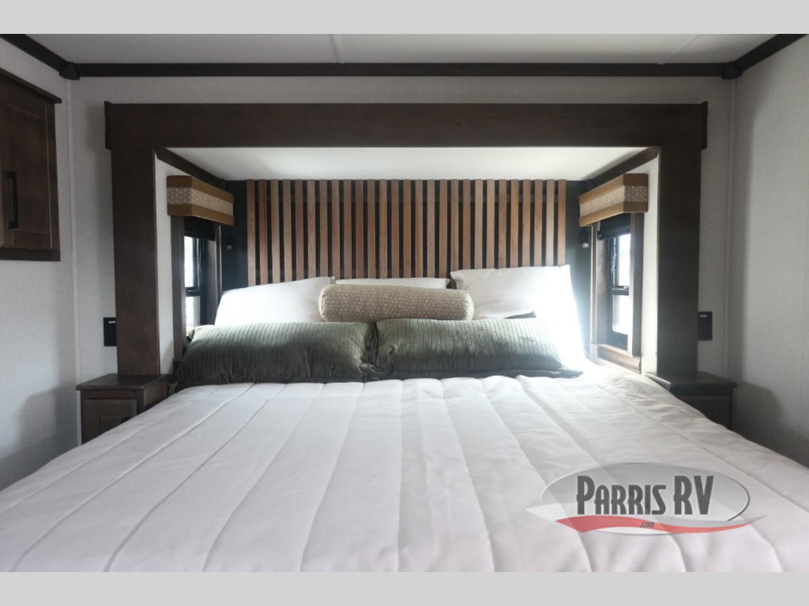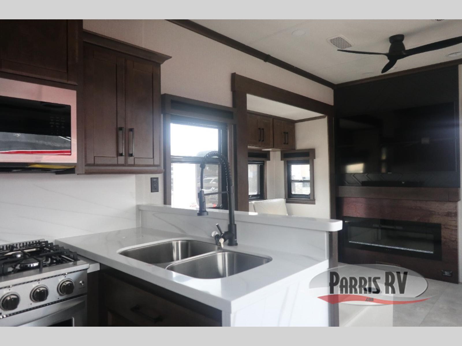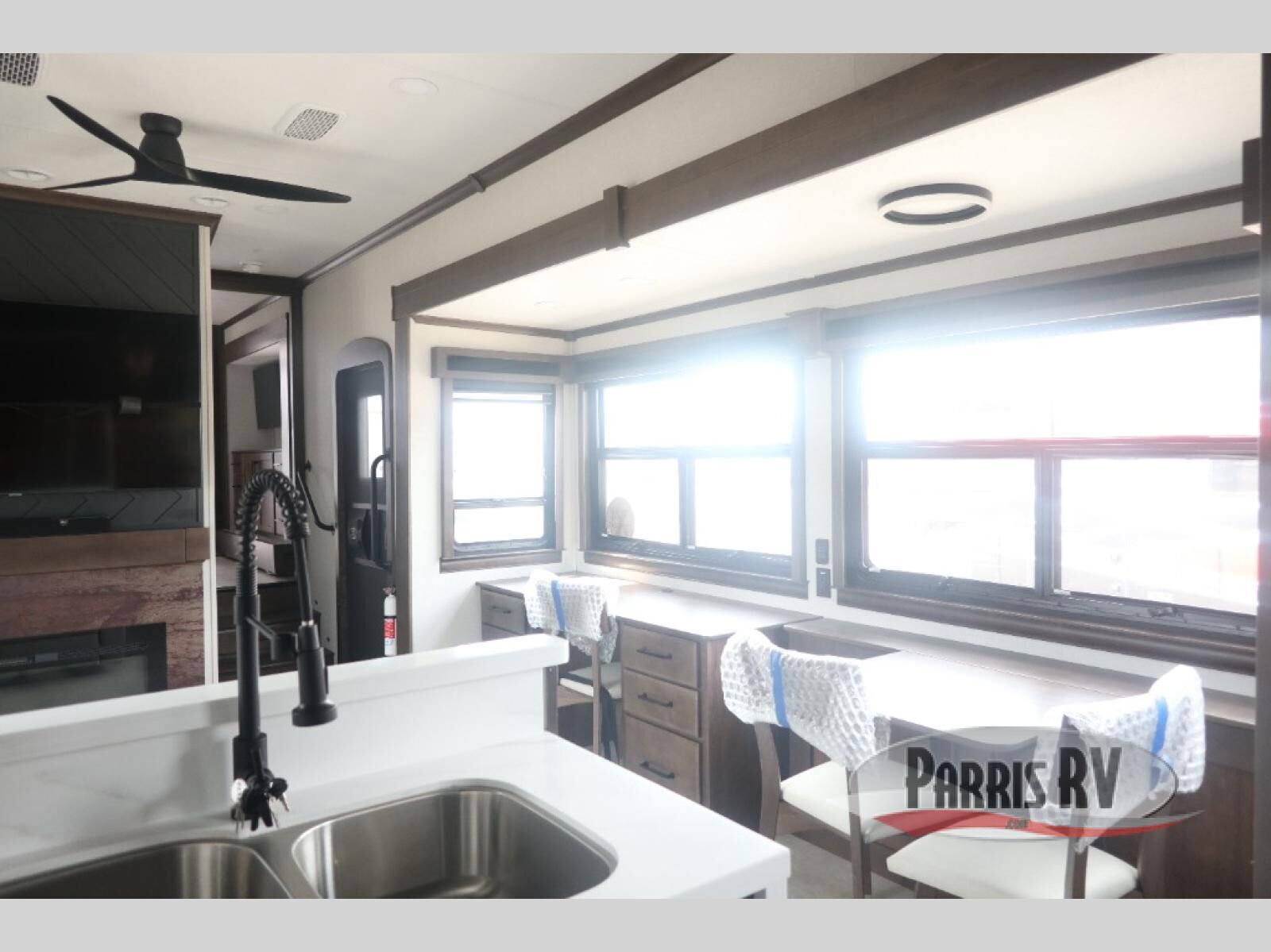 Show your family a good time with this RiverStone fifth wheel! You will get to stay in a super comfortable master suite at the front of this unit which has a dual-sink vanity in the full bathroom. The bedroom offers you a king-size bed that you can rest on while you watch the 40" LED TV across from you, and there is a half bathroom just outside the bedroom for your friends or family to use. If you've decided to bring work with you on the road, you'll be grateful to find a desk in the living area, and the pull-out dinette is a great place to sit down for meals. Work your magic in the kitchen and prepare something delicious on the four-burner range for everyone to eat.