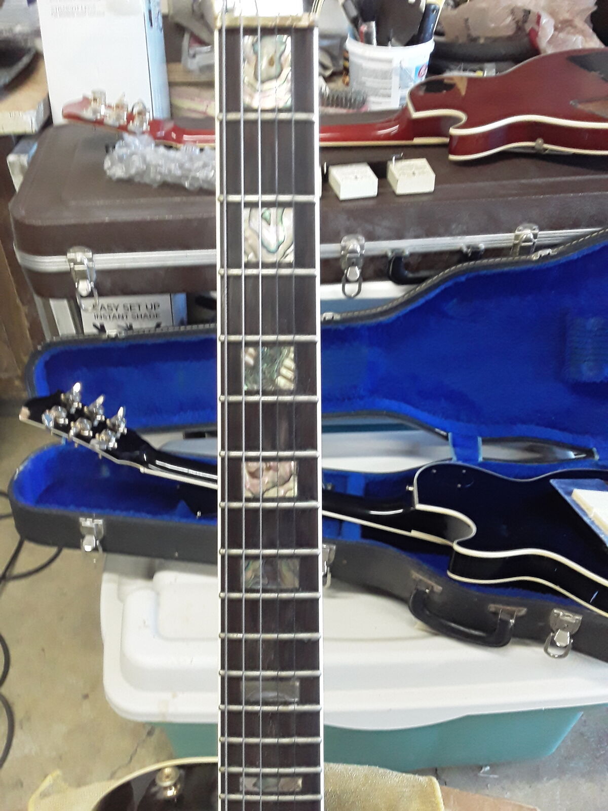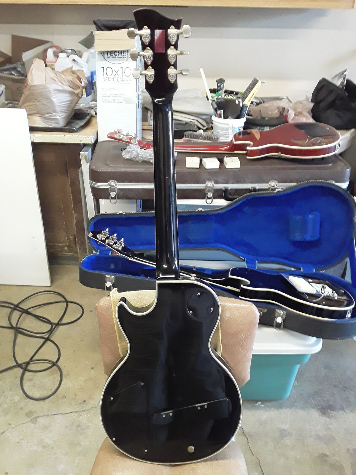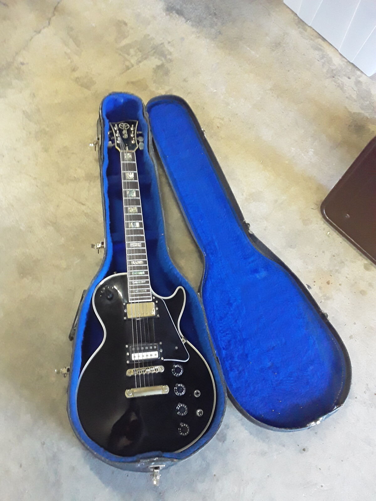 Set neck LP style, black with black pickguard, gold hardware, two Magnaflux pickups (Maxon-same company as Ibanez Tube Screamer). MPC onboard electronics. Brass nut which adds a little brightness for humbucker pickups. Wave head stock so post lawsuit era after 75.