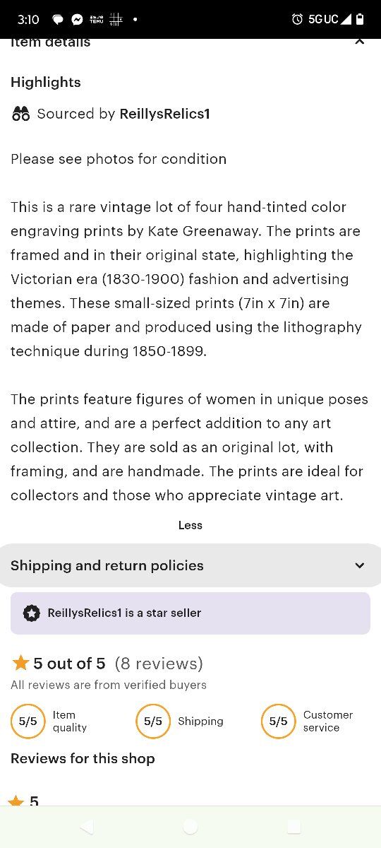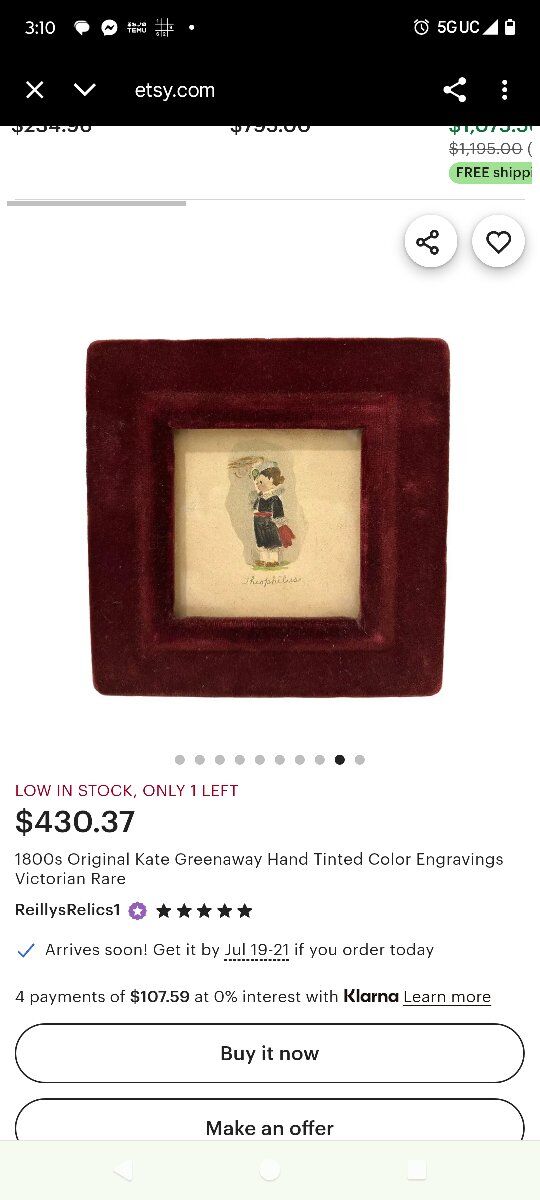 Vintage Kate Greenaway Hand Tinted Color Engraving. Victorian era.